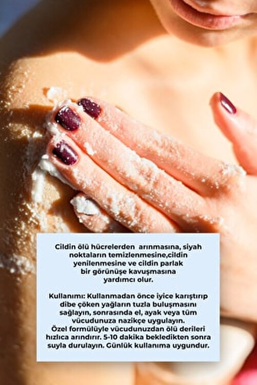 It helps to cleanse the skin from dead cells, cleanse black dots, regenerate the skin and give the skin a radiant appearance. Usage: Before use, mix thoroughly and let the fat settling on the bottom meet with salt, then gently apply to your hands, feet or whole body. With its special formula, it quickly cleans dead skin from your body. After waiting 5-10 minutes, rinse with water. Suitable for daily use. Ingredients/ingredients: Sodium chloride, brassica campestris seed oil, glycerin, parfum (fragrance), cocos nucifera oil.