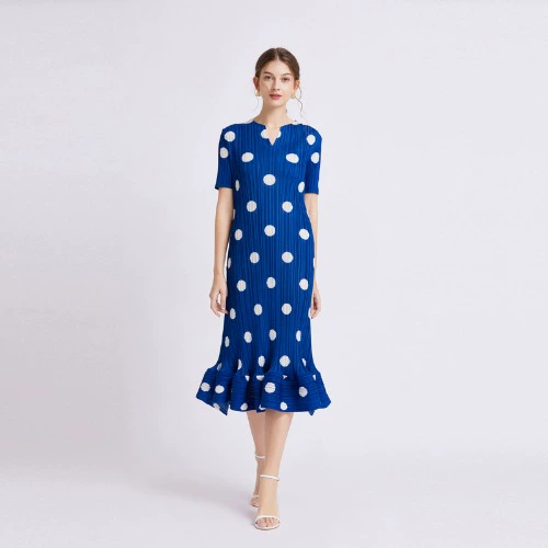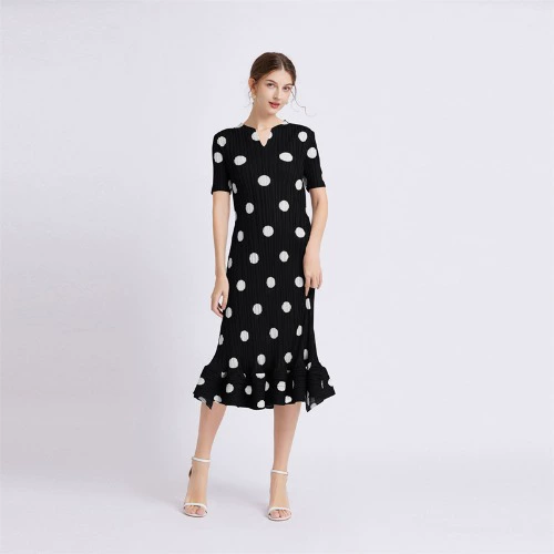 Miyake’s pleated niche age-reducing comfortable polka dots and short-sleeved short-sleeved dress summer