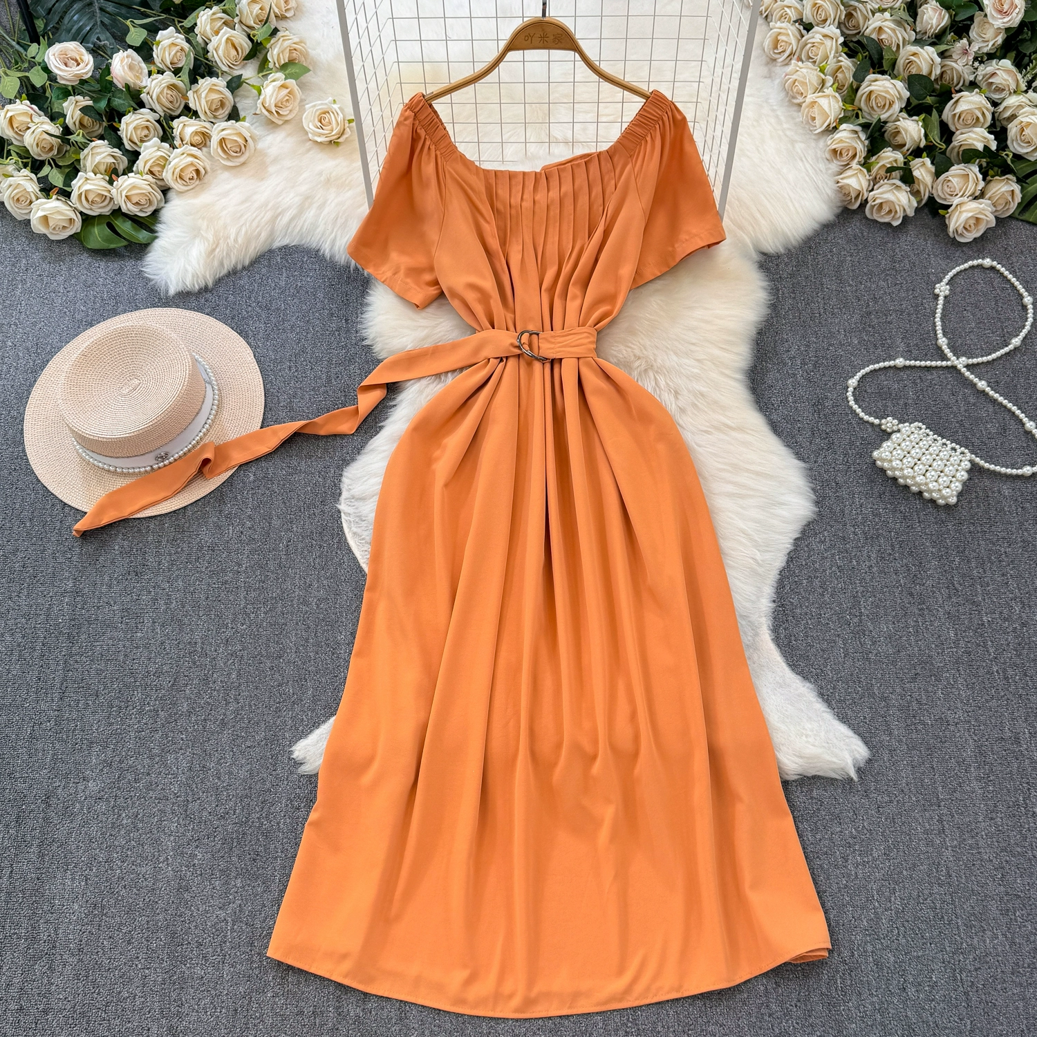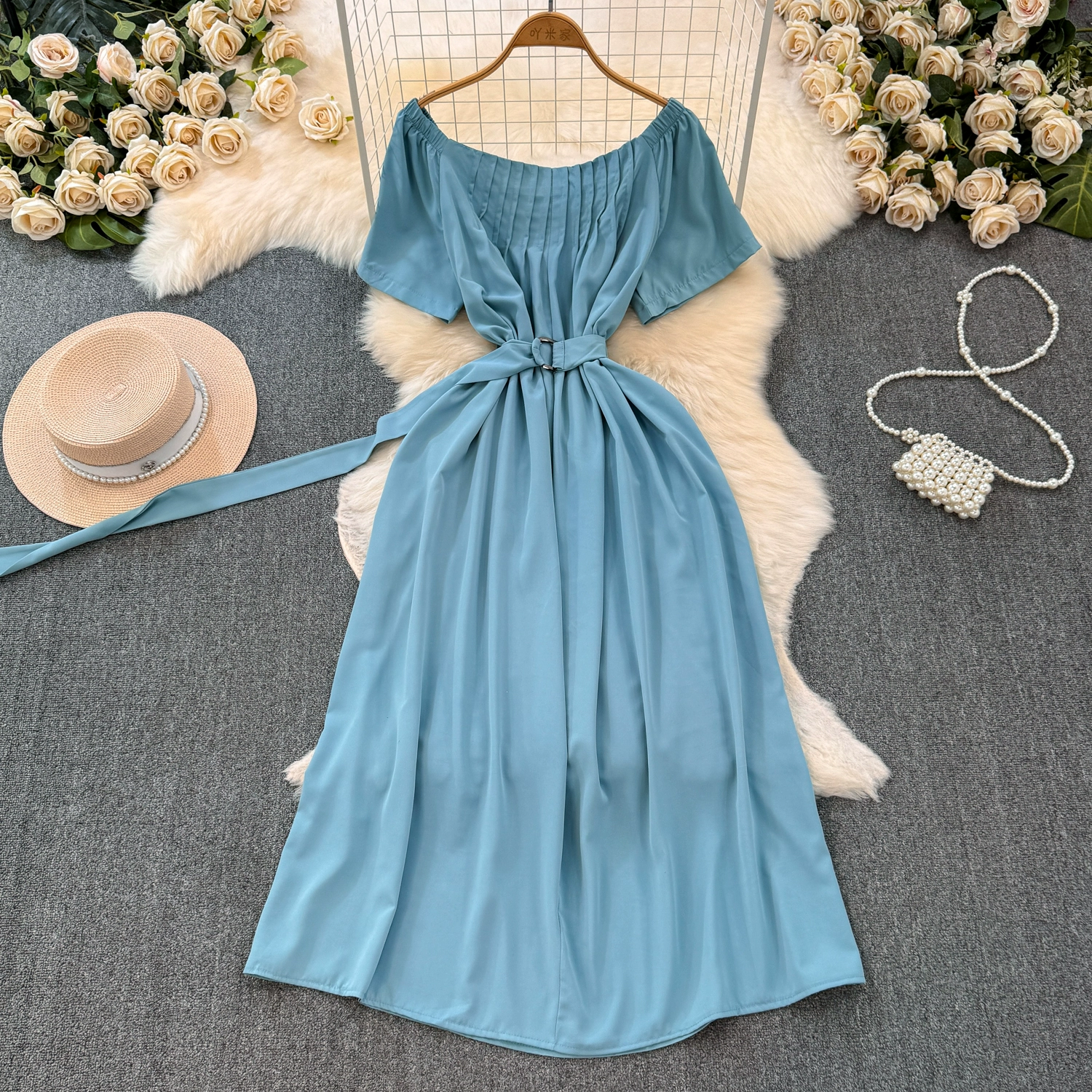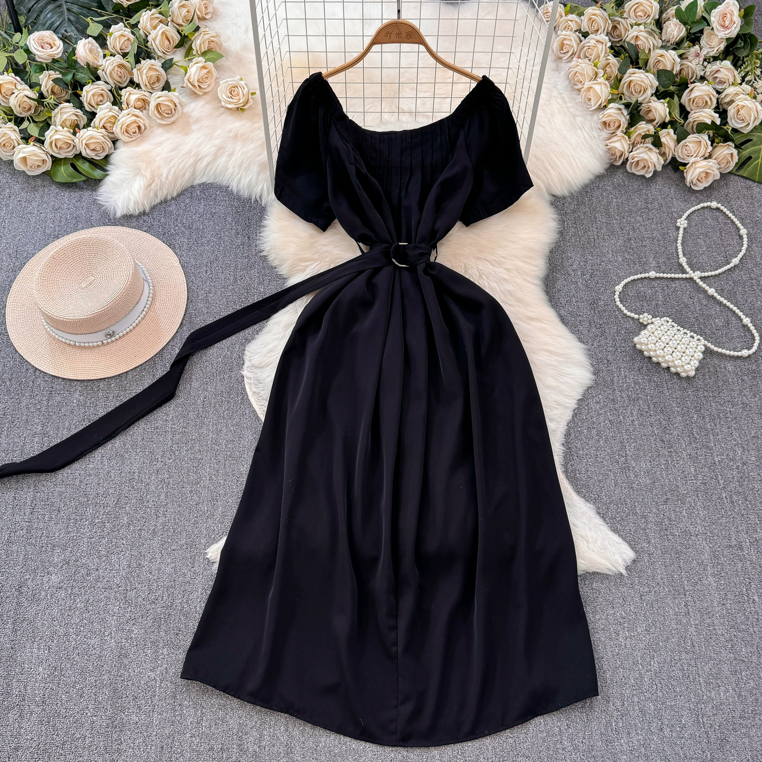 Light and mature style retro temperament bubble short-sleeved square neckline waist slimming A-line dress elegant long dress