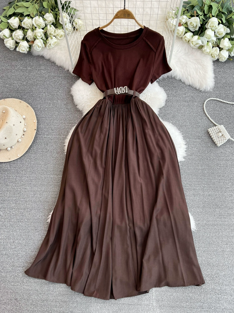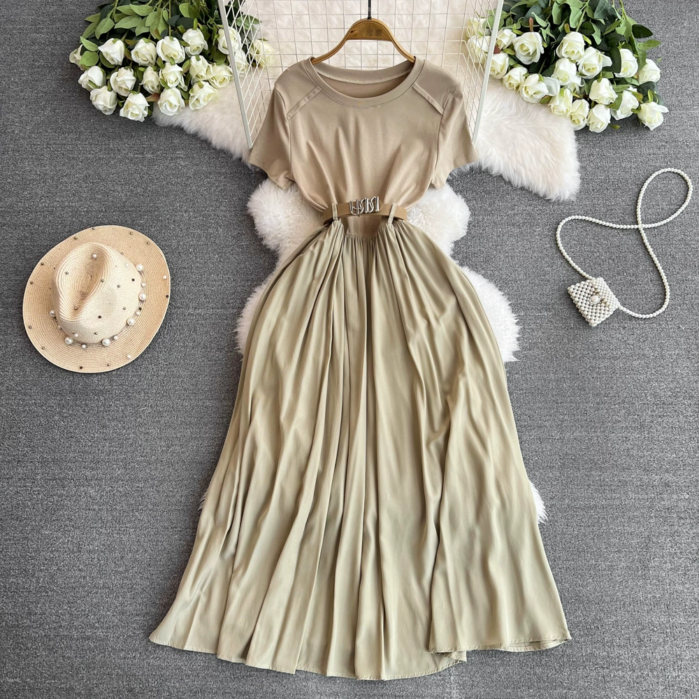 | nameOriginal | Light and mature style round neck short-sleeved dress for women summer niche design waist slimming A-line long skirt with large hem |