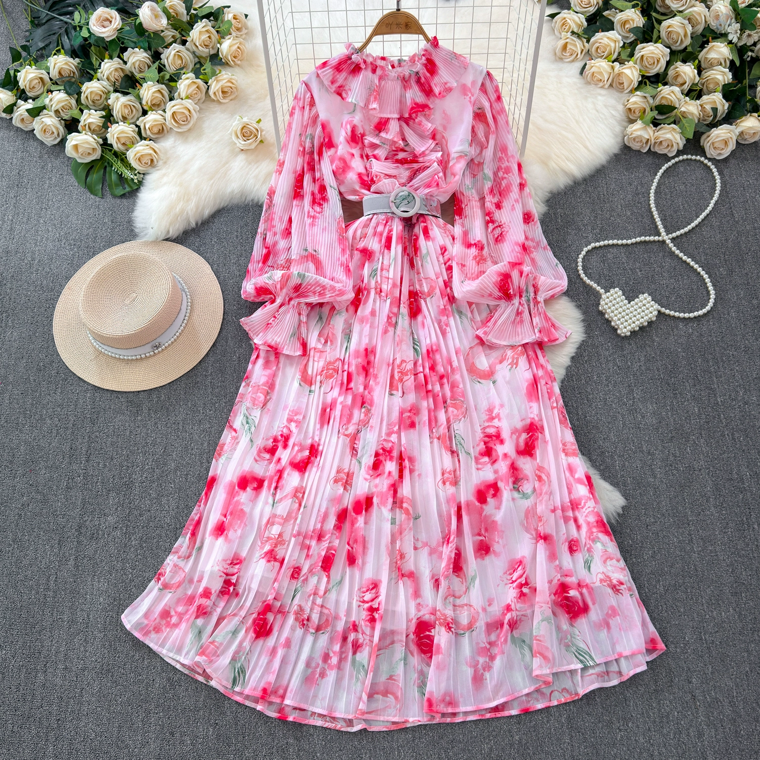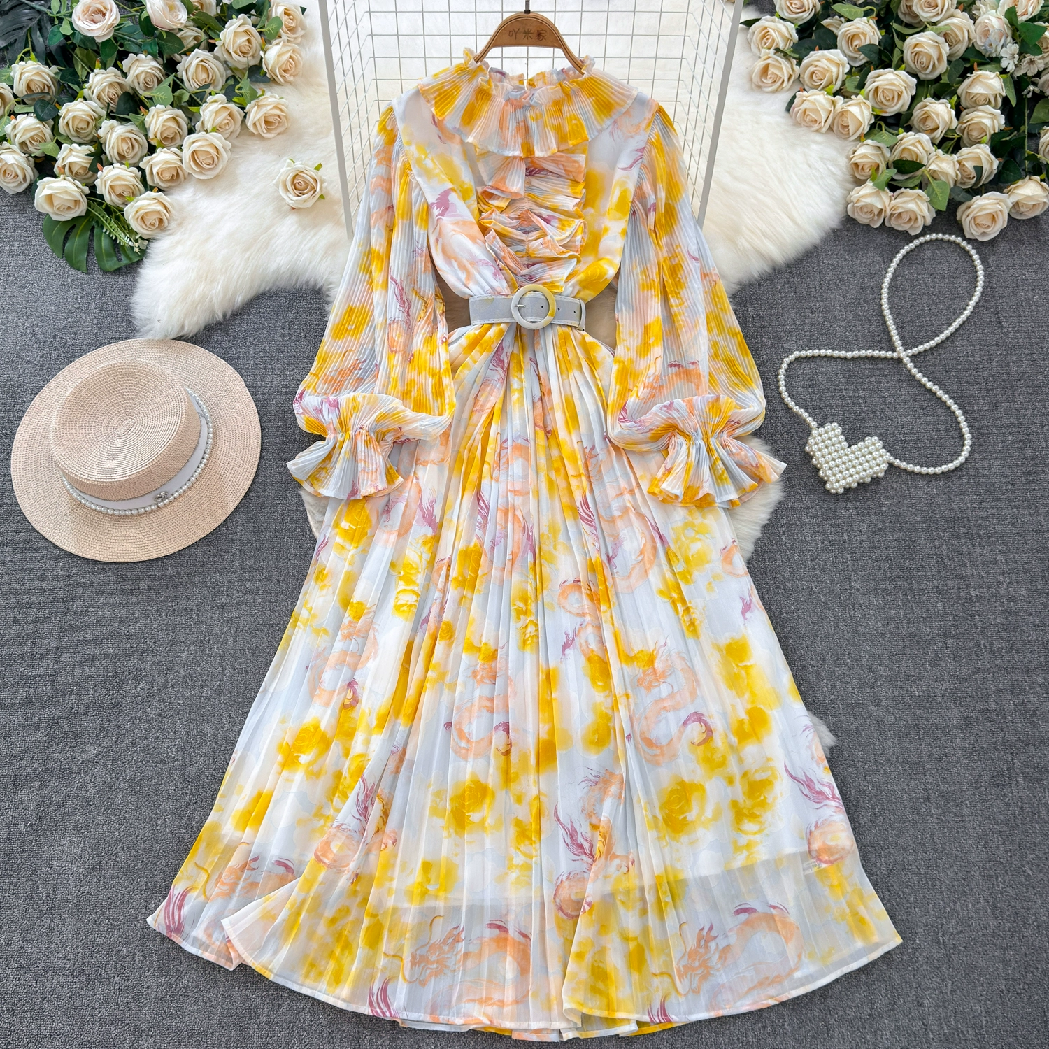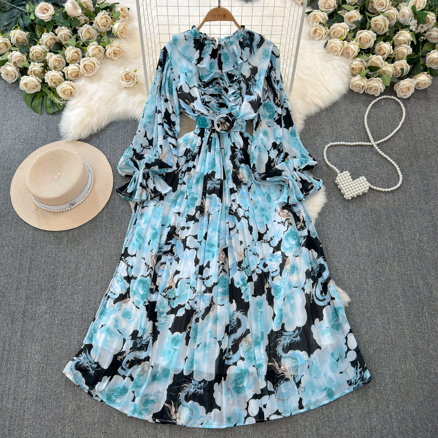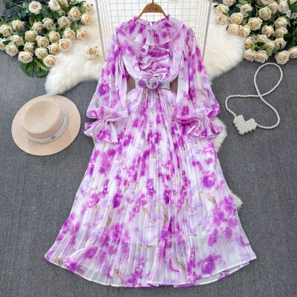 | nameOriginal | Light and sophisticated retro style long-sleeved round neck waist slimming A-line printed pleated dress elegant long skirt |