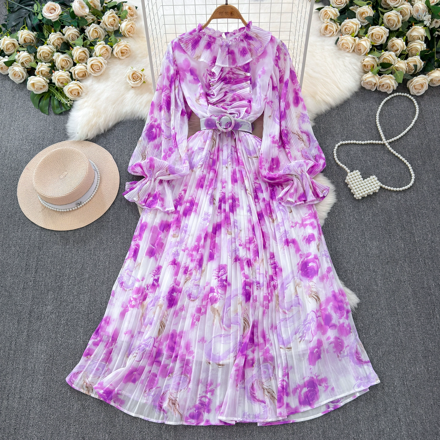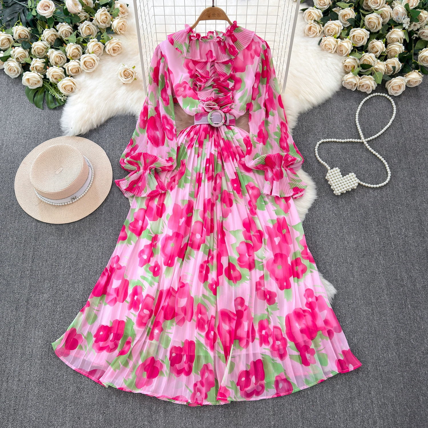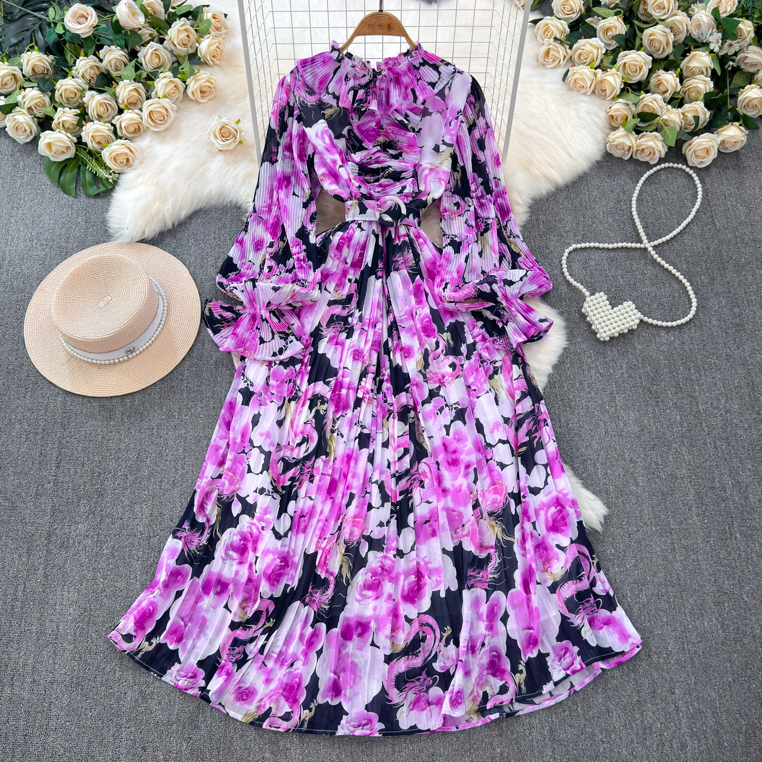 | nameOriginal | Light and sophisticated retro style long-sleeved round neck waist slimming A-line printed pleated dress elegant long skirt |