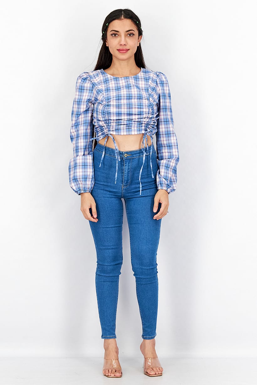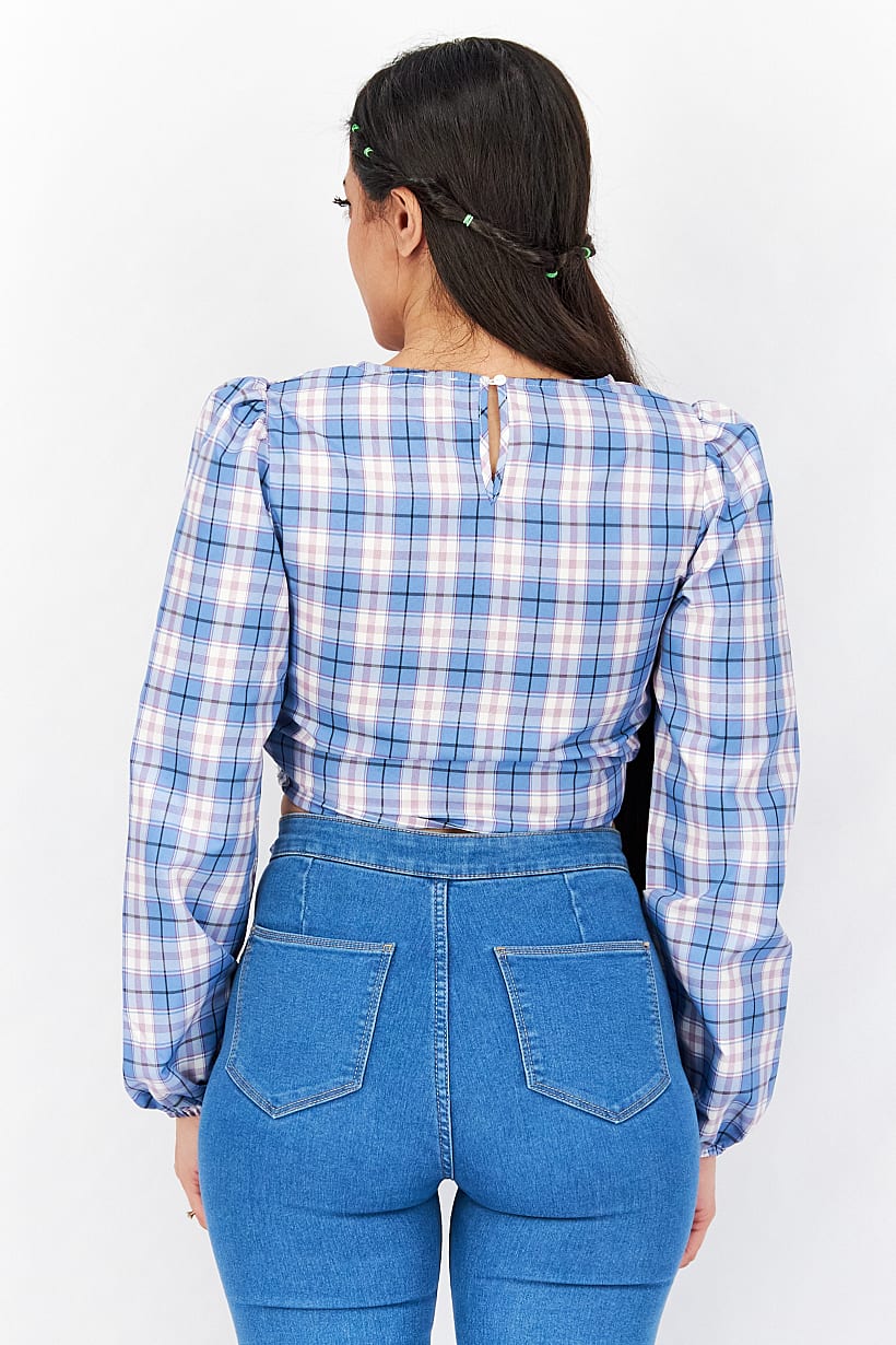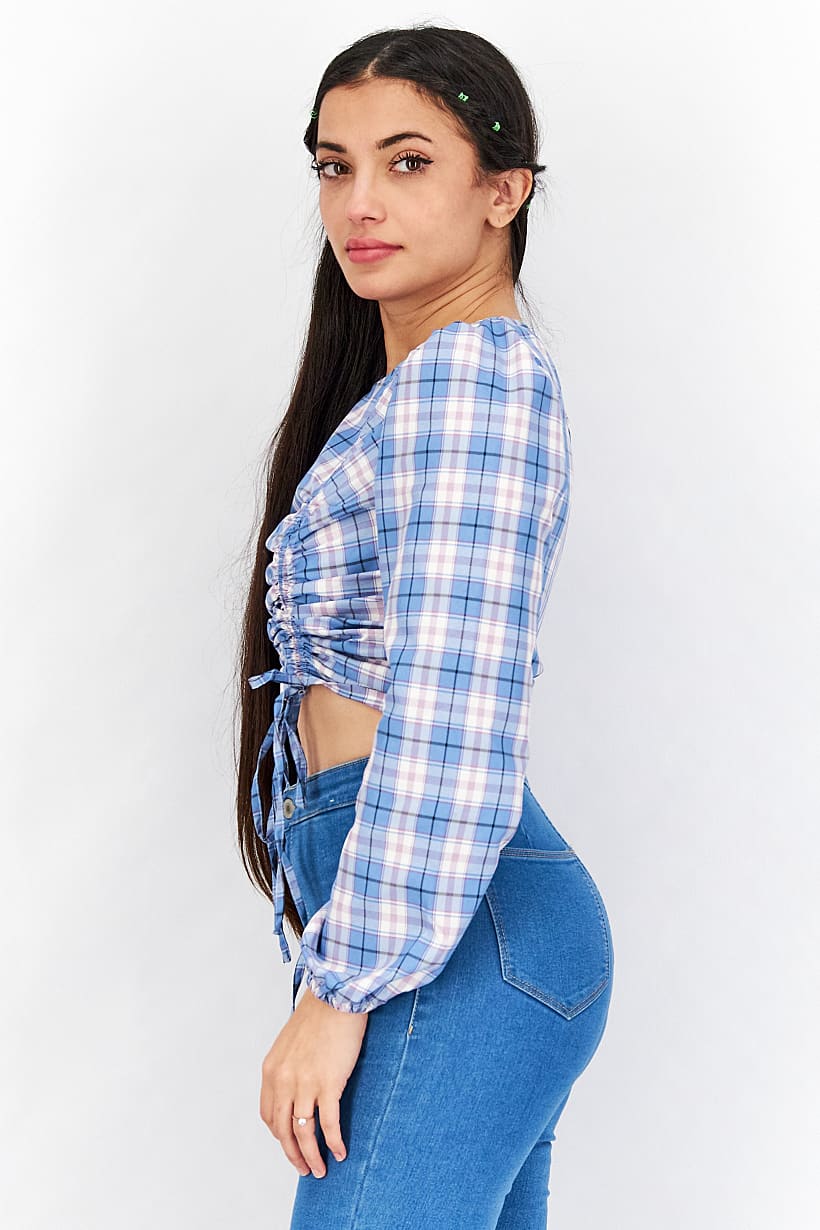 Light Blue Combo Checkered Long Sleeve Women’s Crew Neck Top.