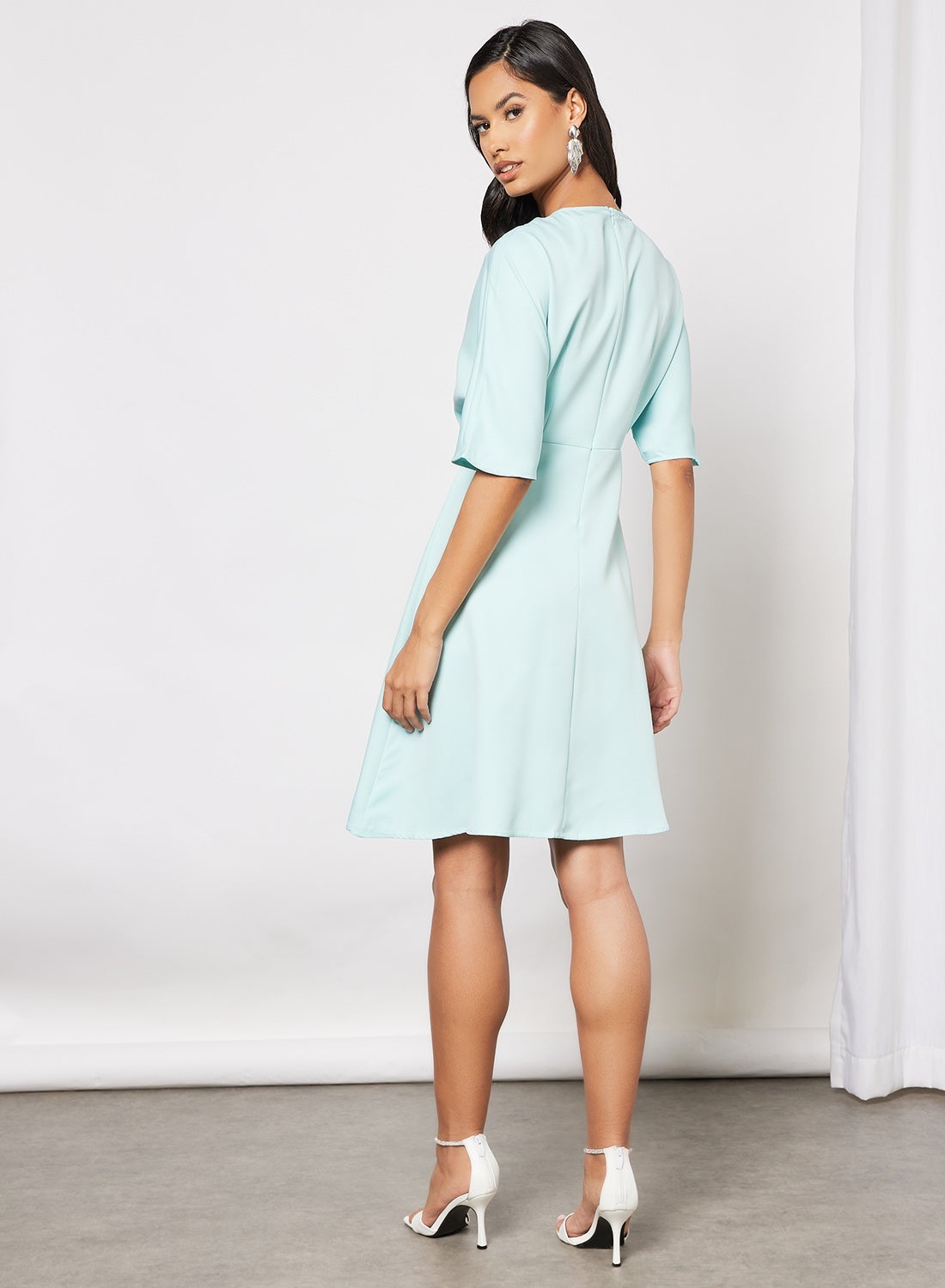 Light Blue Knee-Length Dress with Short Sleeves and Round Neckline.