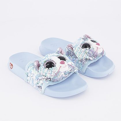 Light Blue Sequin Flip Flops with Whimsy The Cat Design for Girls.