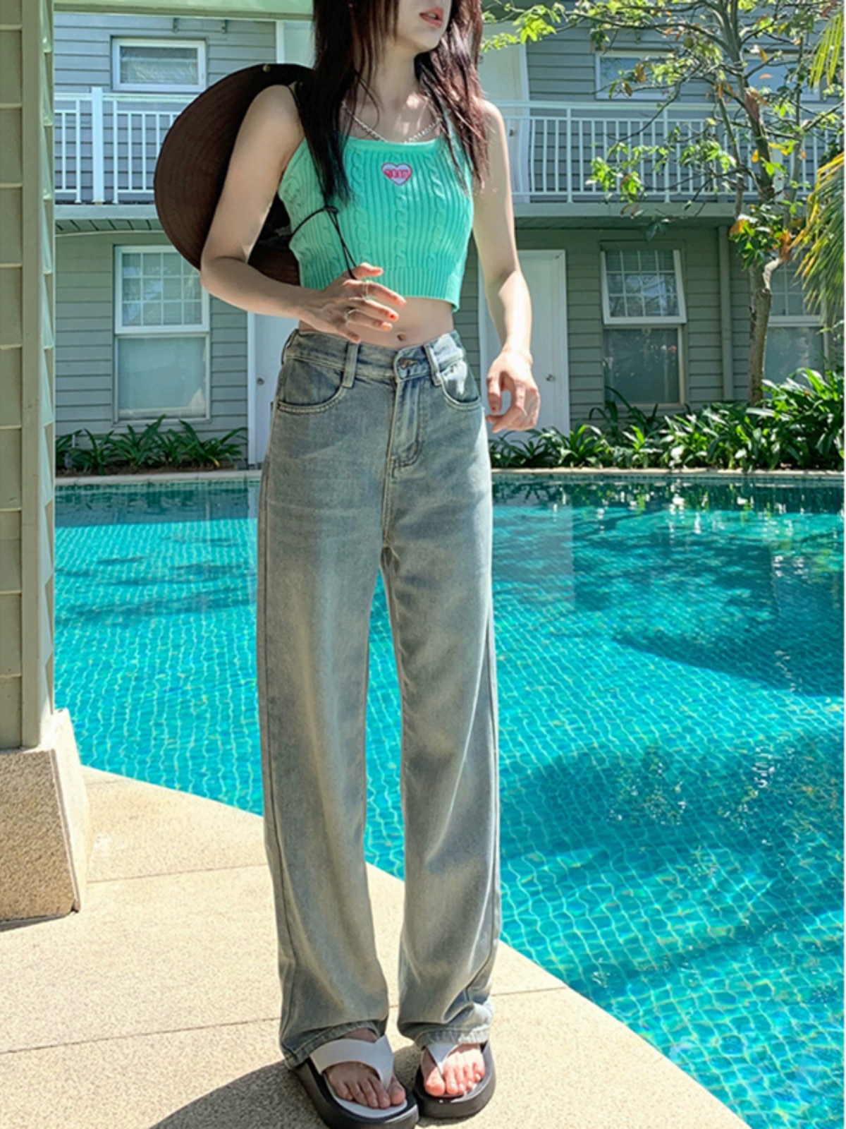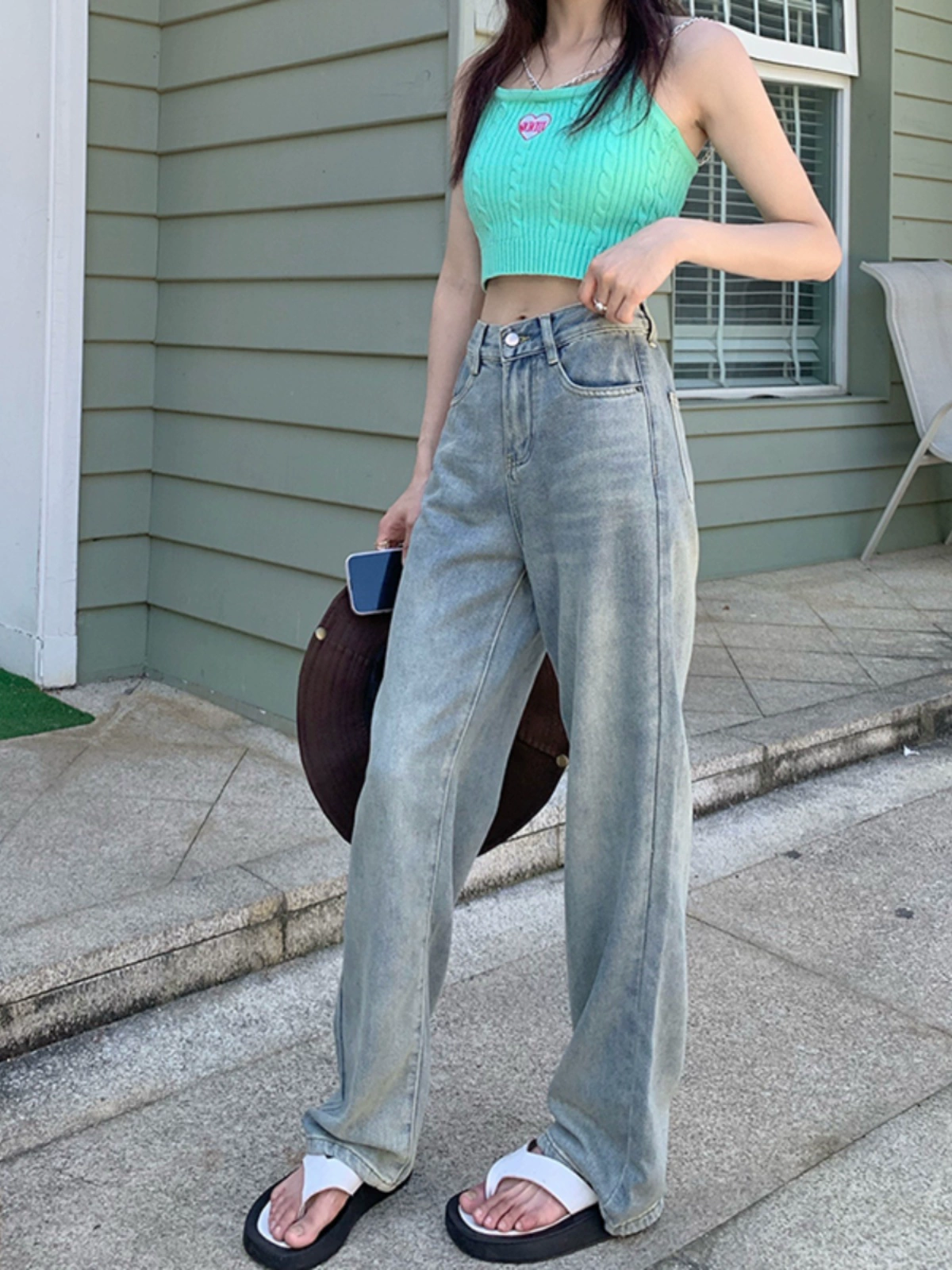 | nameOriginal | Light-colored spring high-waisted straight floor-length denim trousers |