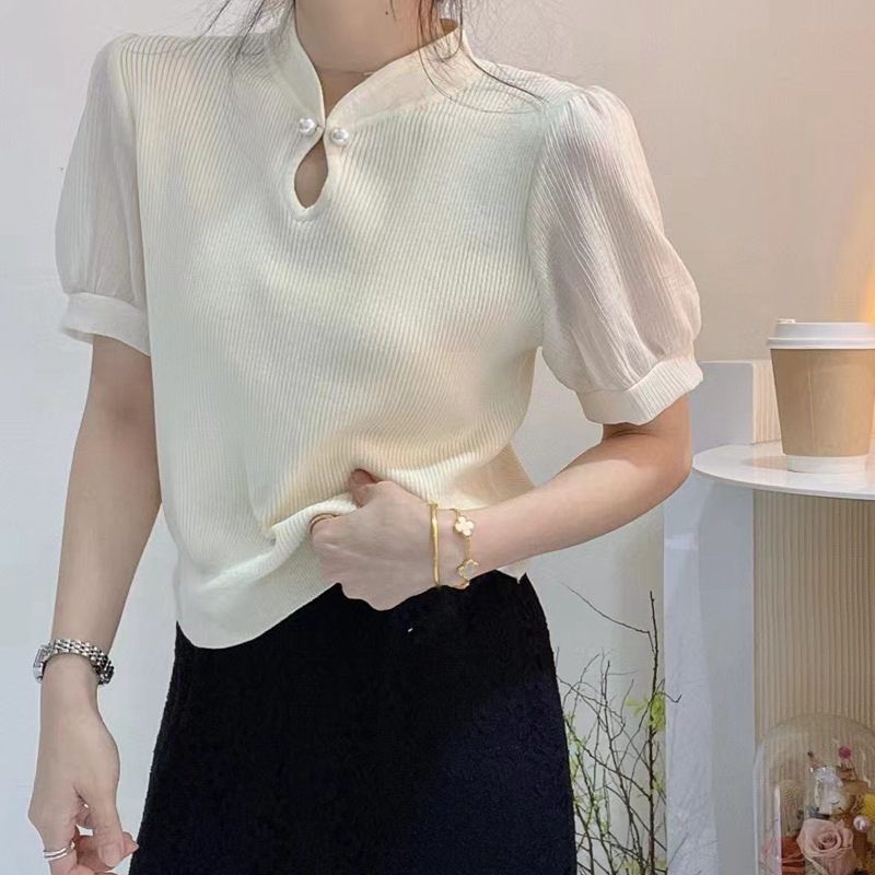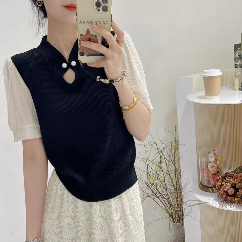 | nameOriginal | Light Guofeng Buckle Contrast Color Chiffon Knitted T-shirt Women's 2024 Summer Knitted Shirt Chinese Chic Western Style Top |