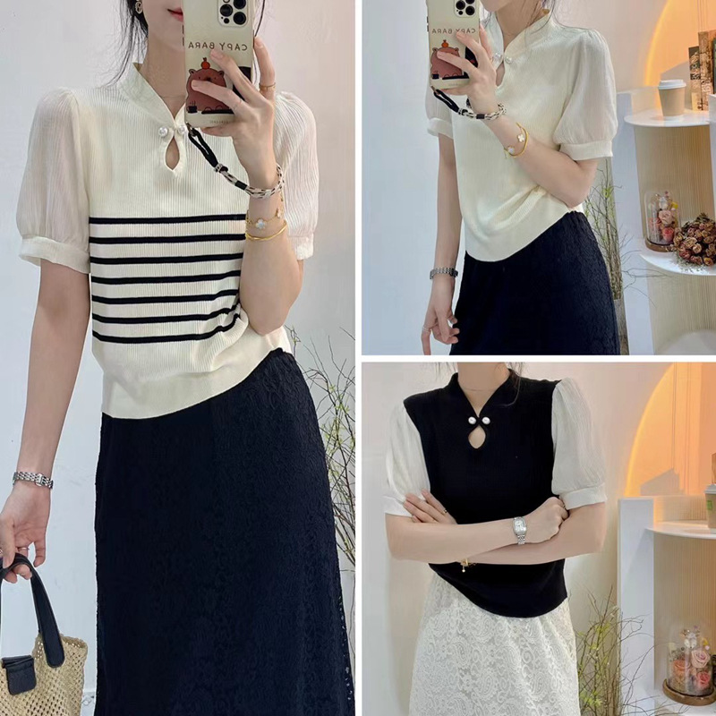 | nameOriginal | Light Guofeng Buckle Contrast Color Chiffon Knitted T-shirt Women's 2024 Summer Knitted Shirt Chinese Chic Western Style Top |