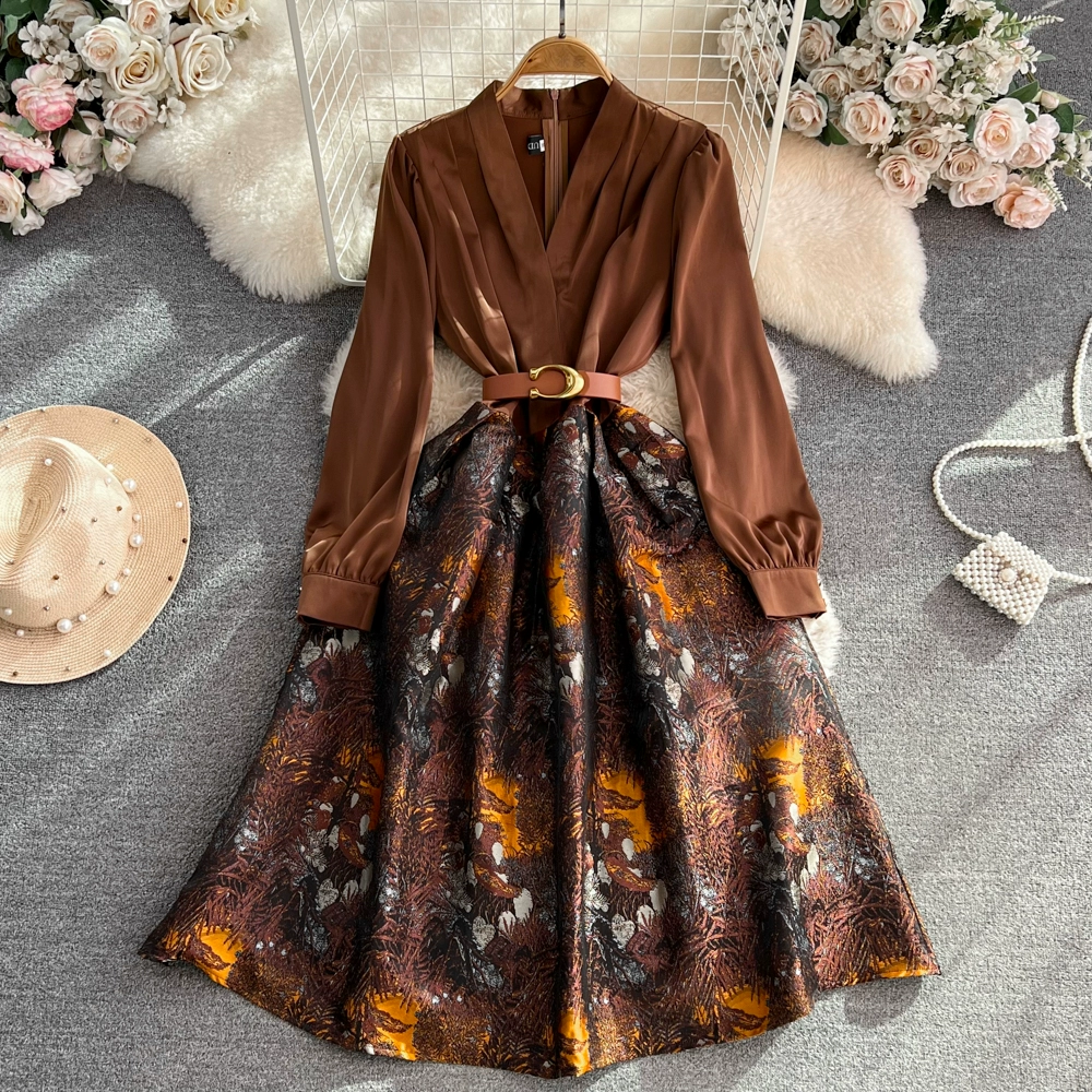 Light luxury and fashionable bubble V-neck printed wide skirt dress