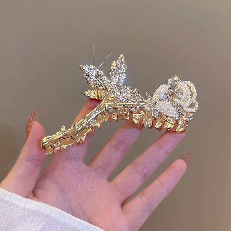 | nameOriginal | Light luxury diamond-encrusted rose flower hair clip with elegant pearls |