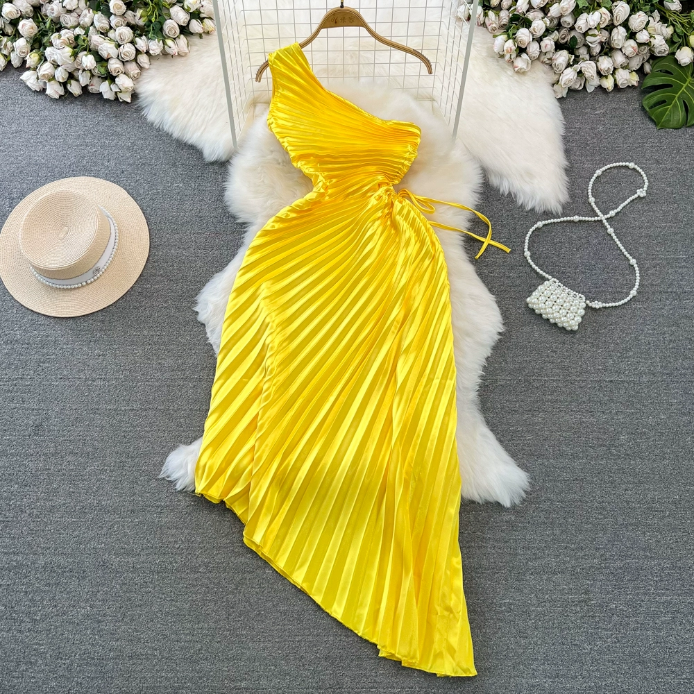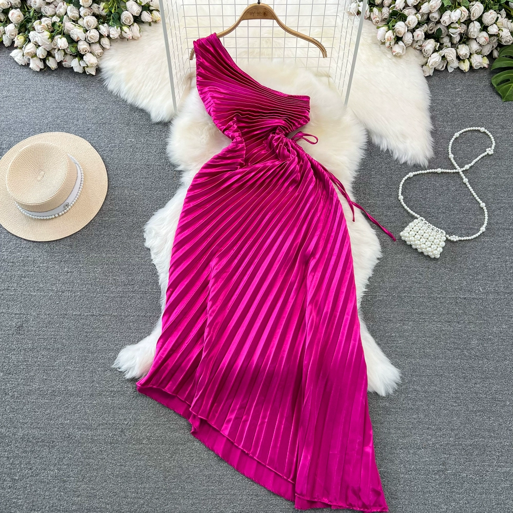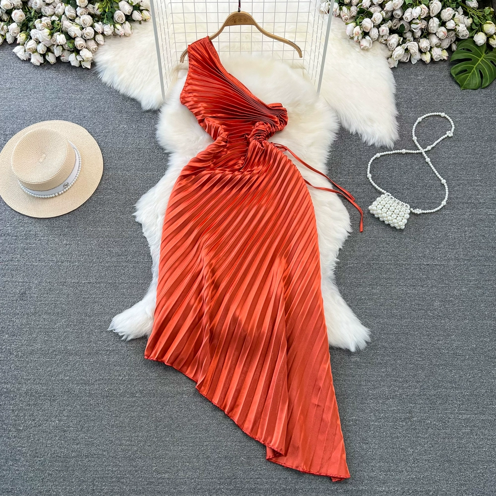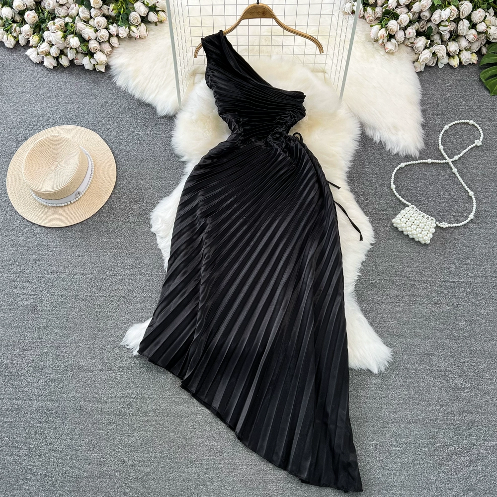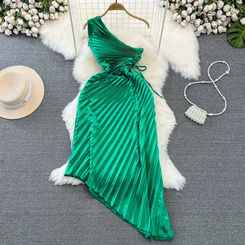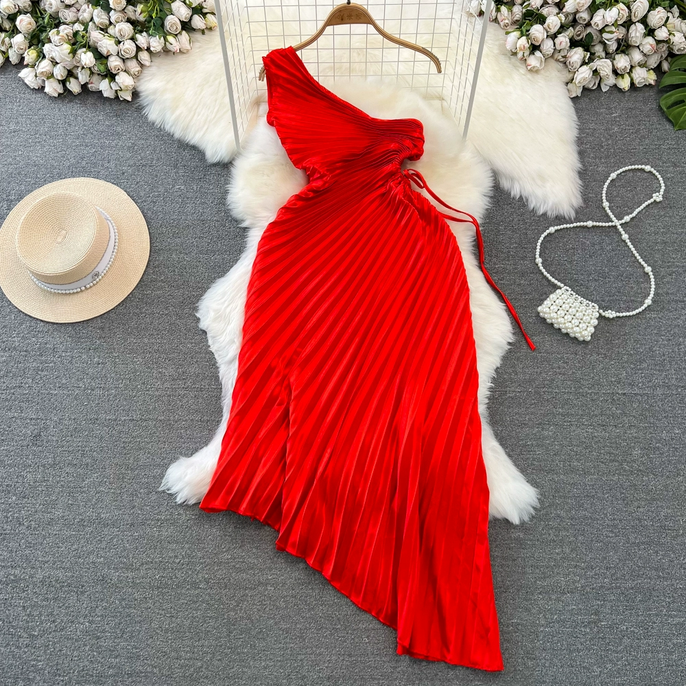 Light luxury fashionable slope neck off-shoulder pleated dress