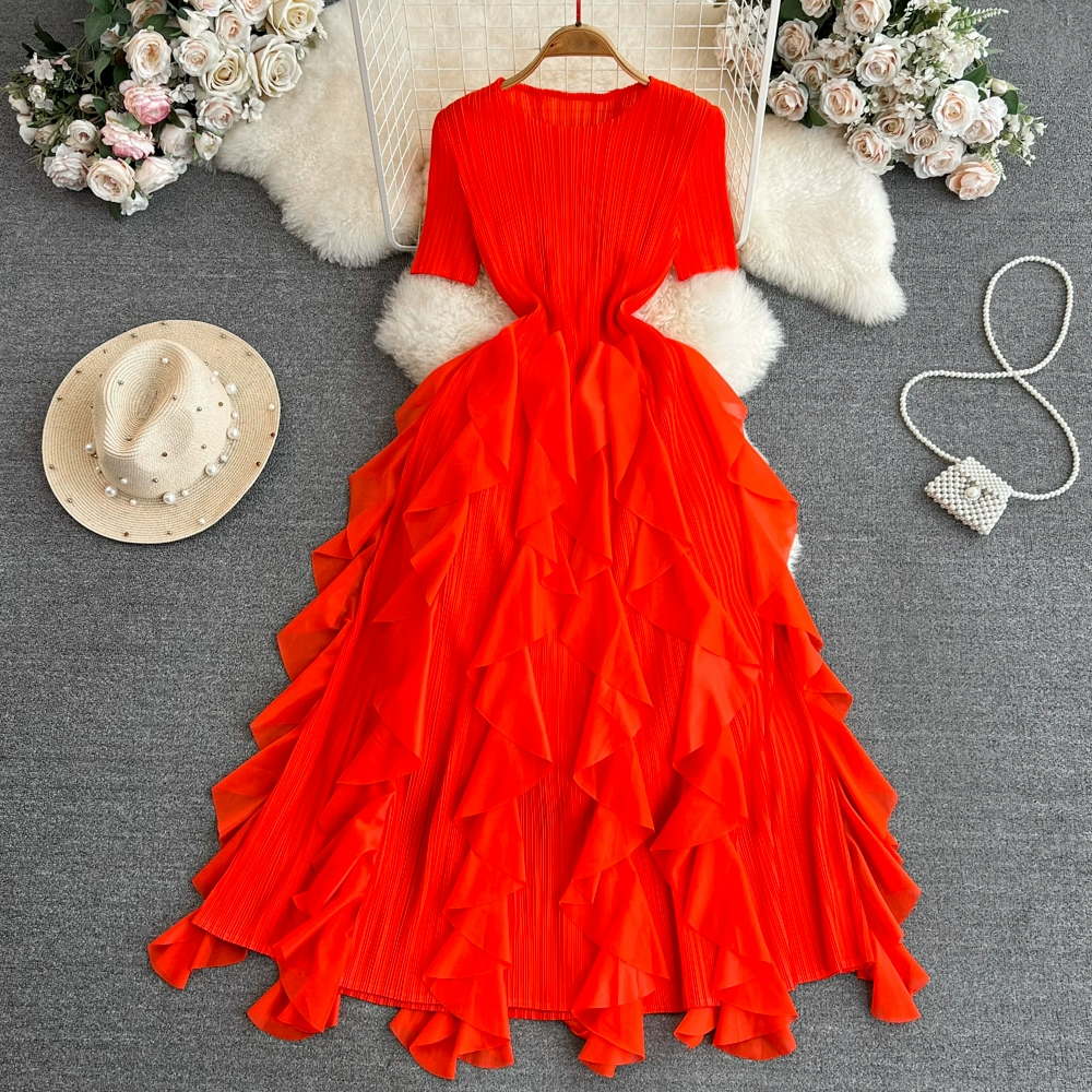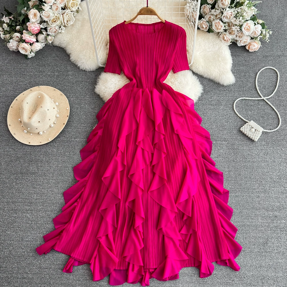 Light luxury Miyake pleated waist cake dress short sleeves