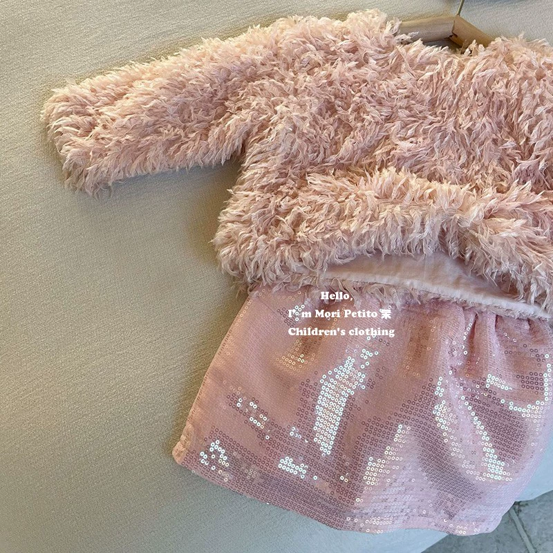 | nameOriginal | Light luxury niche design girl's furry sweatshirt pink sequin bling skirt suit 2024 spring and autumn |
