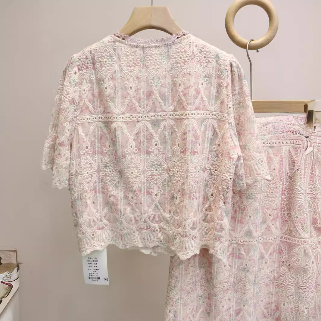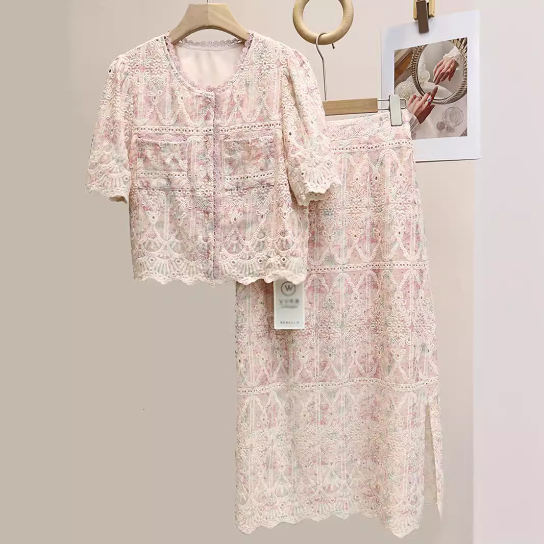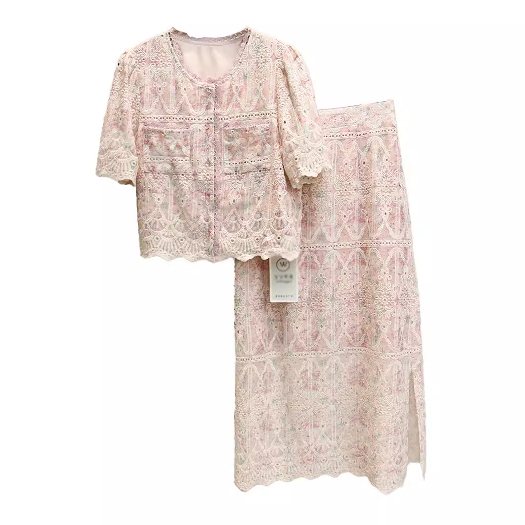 | nameOriginal | Light Luxury Socialite Style Pink Lace French Dress Women's Summer Short Sleeve Suit Design Sense Heavy Industry Skirt suit |