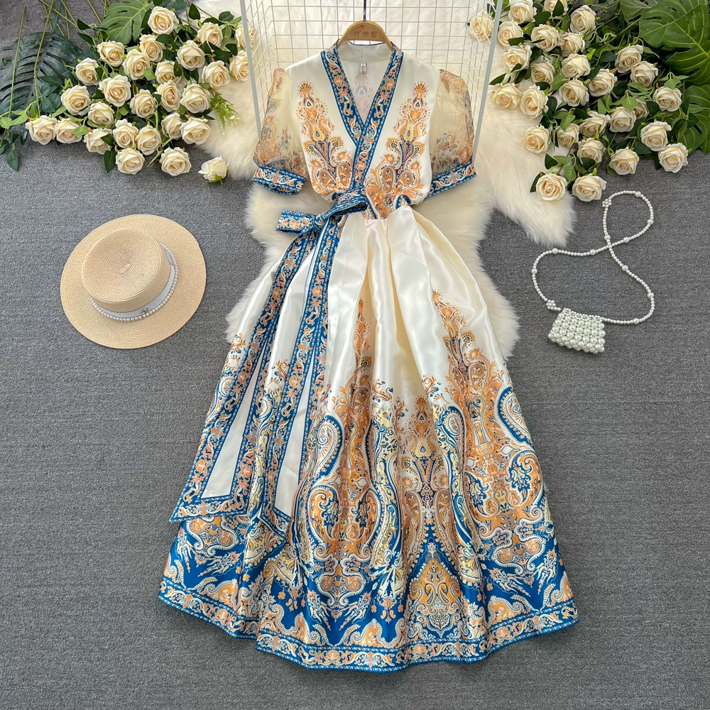 Light luxury V-neck A-line dress with elegant wide hem and short sleeves