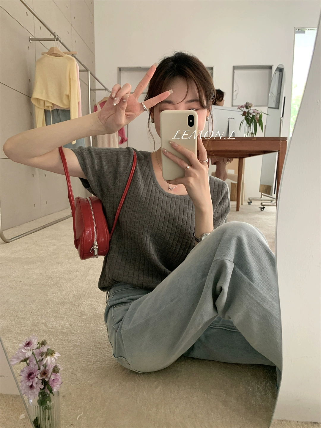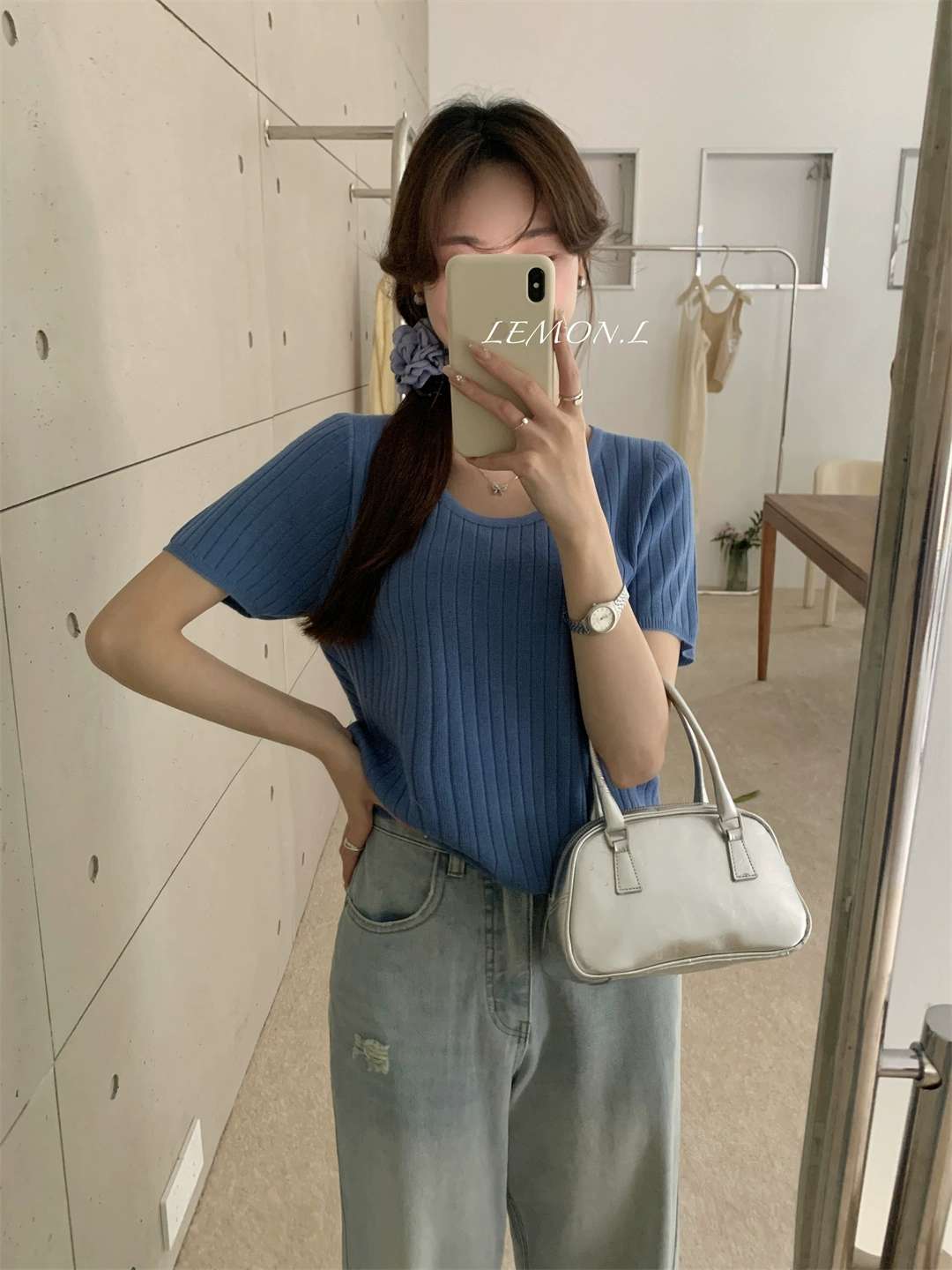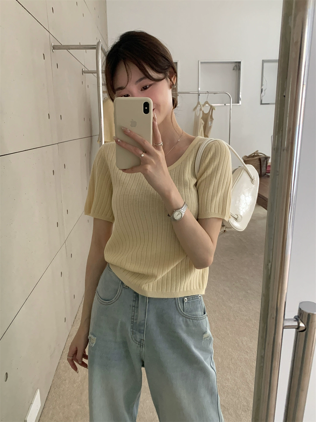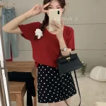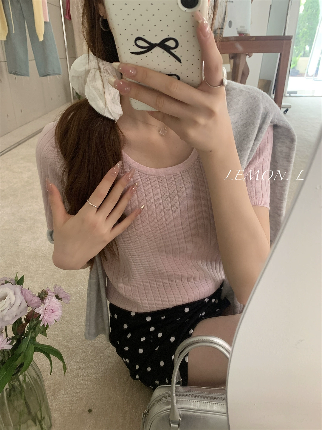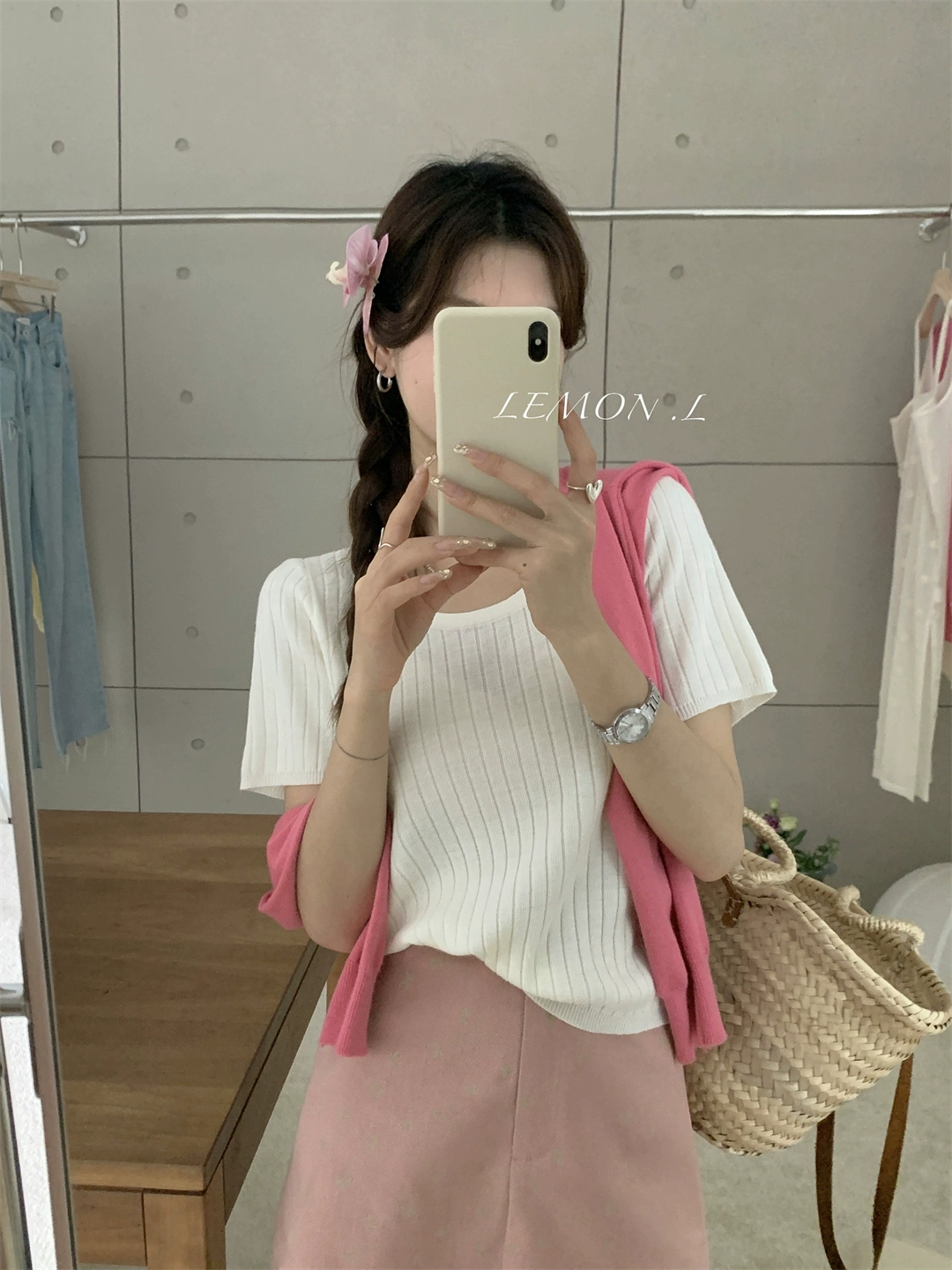 | nameOriginal | Light pink right shoulder round neck soft waxy short-sleeved sweater |