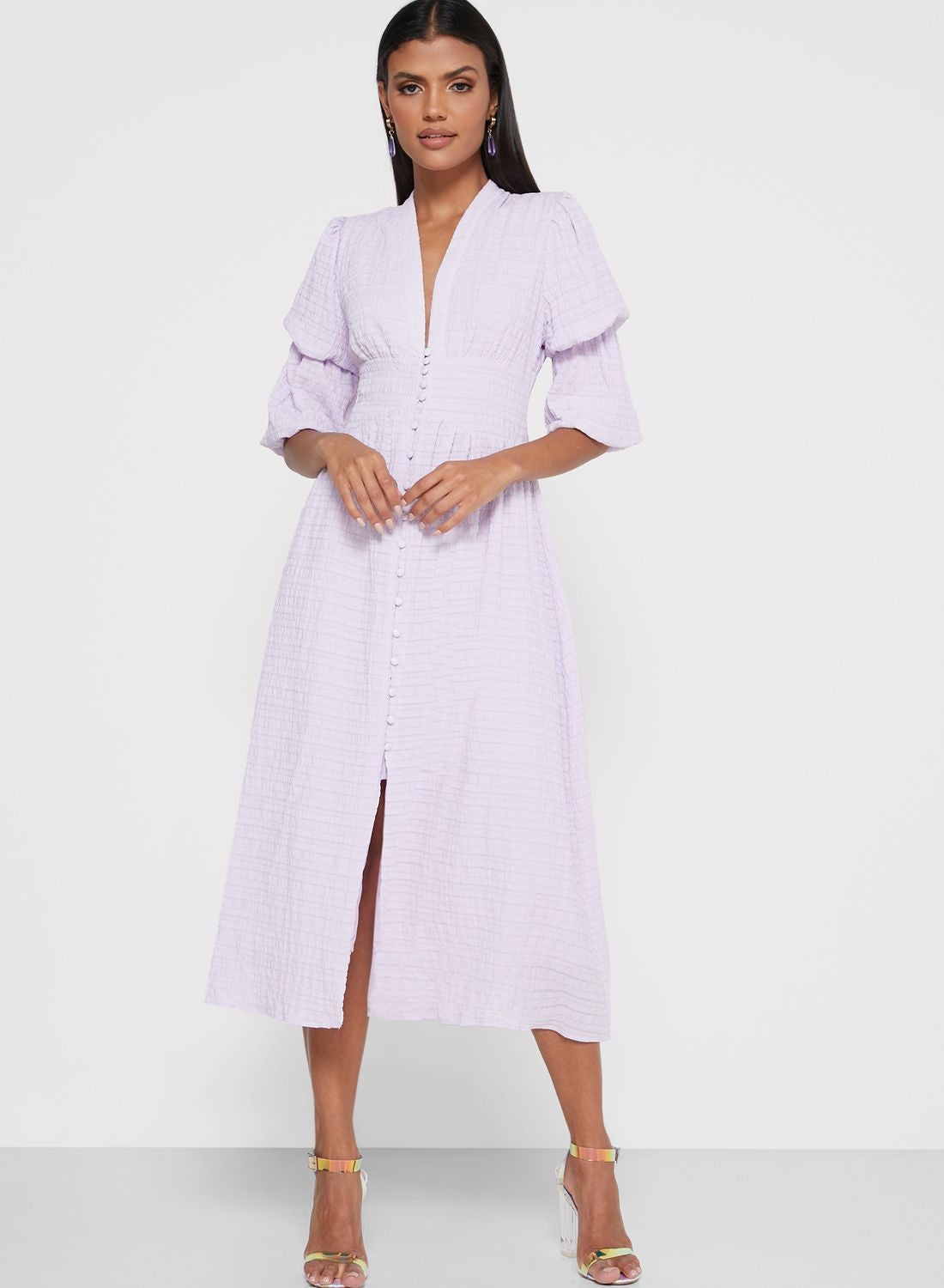 | nameOriginal | Solid Pattern Puff Sleeve Midi Dress Light Purple |