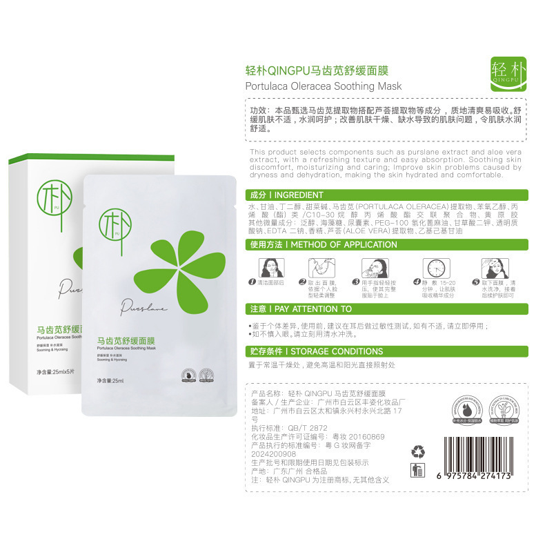 | nameOriginal | Light simple purslane soothing mask sensitive muscle men and women moisturizing shrink pores after sun repair brightening wholesale |