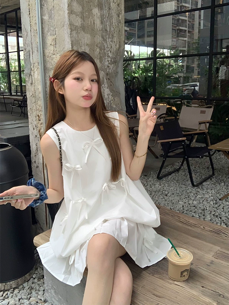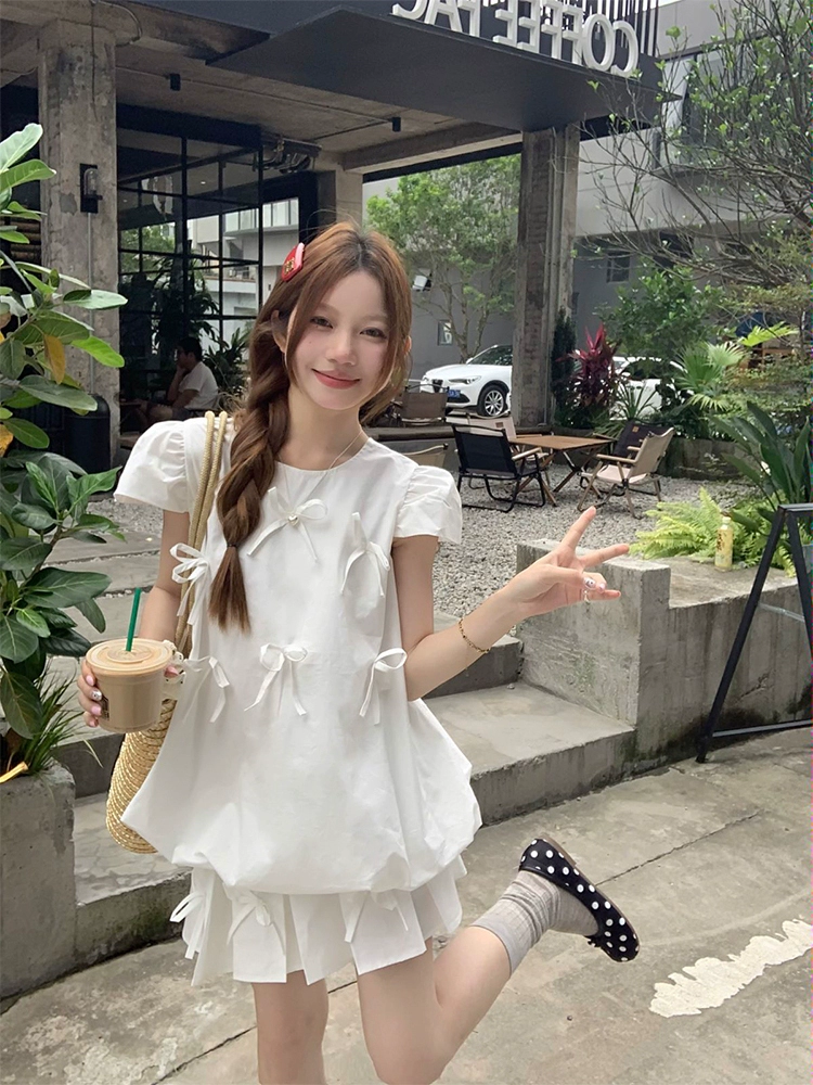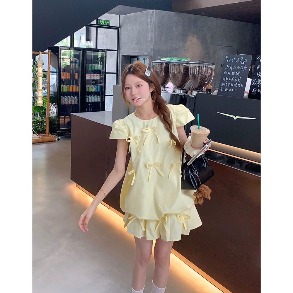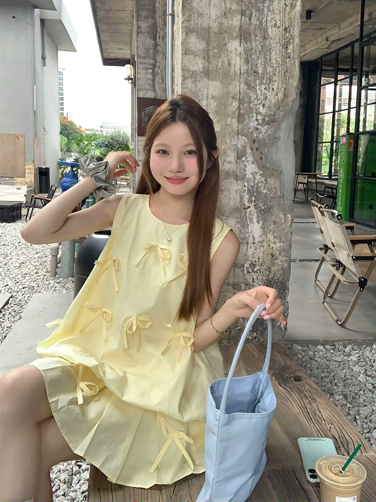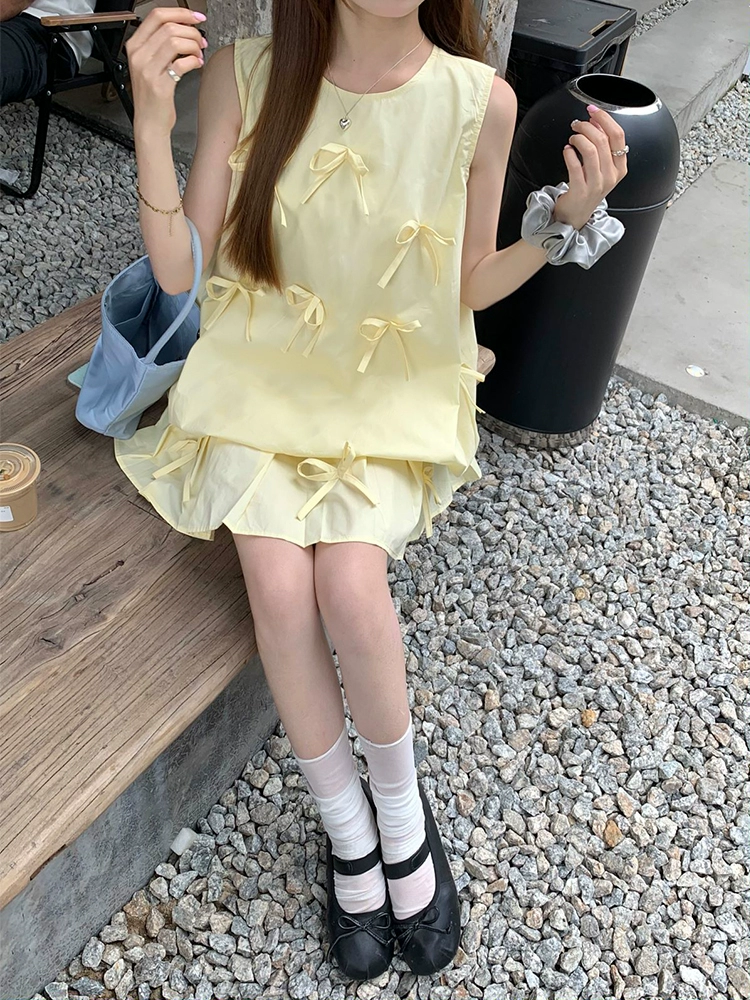 | nameOriginal | Light yellow chic short-sleeved pleated skirt with bow |