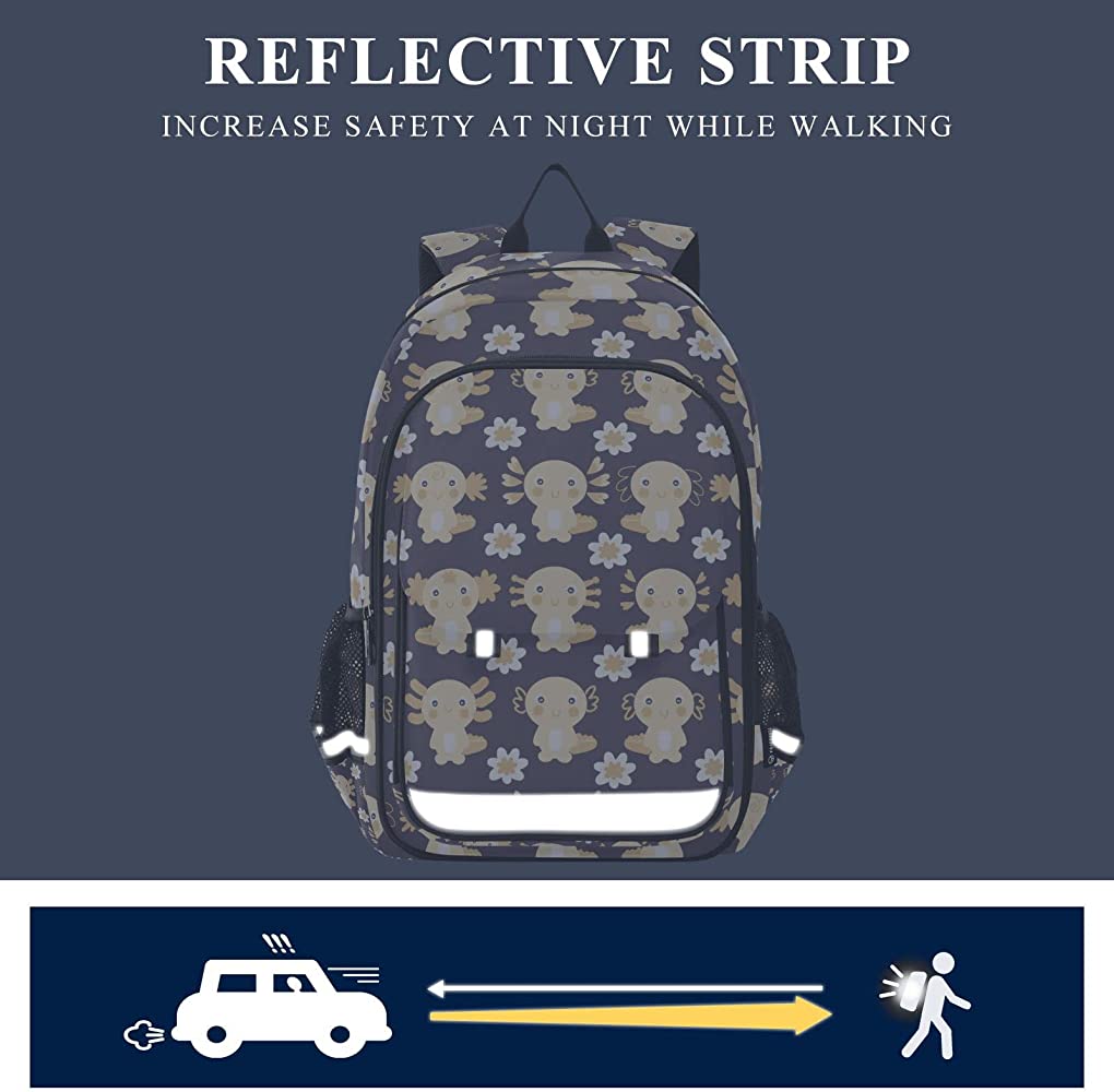 The backpack is adorned with a beautiful print of axolotls and flowers, making it a unique and eye-catching accessory. The reflective stripes on the backpack ensure that you are visible even in low-light conditions, making it a safe choice for night-time travel.