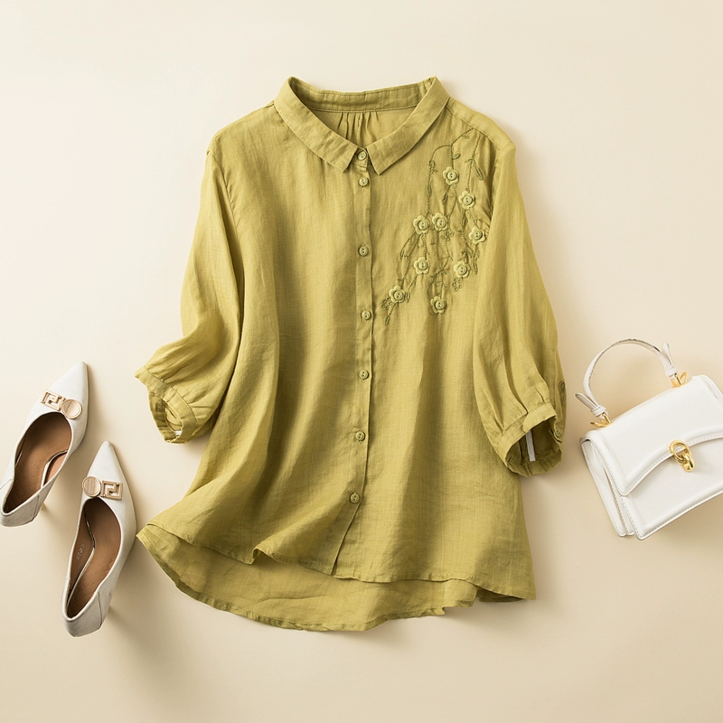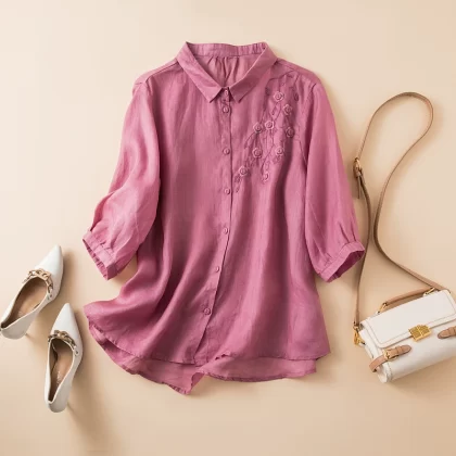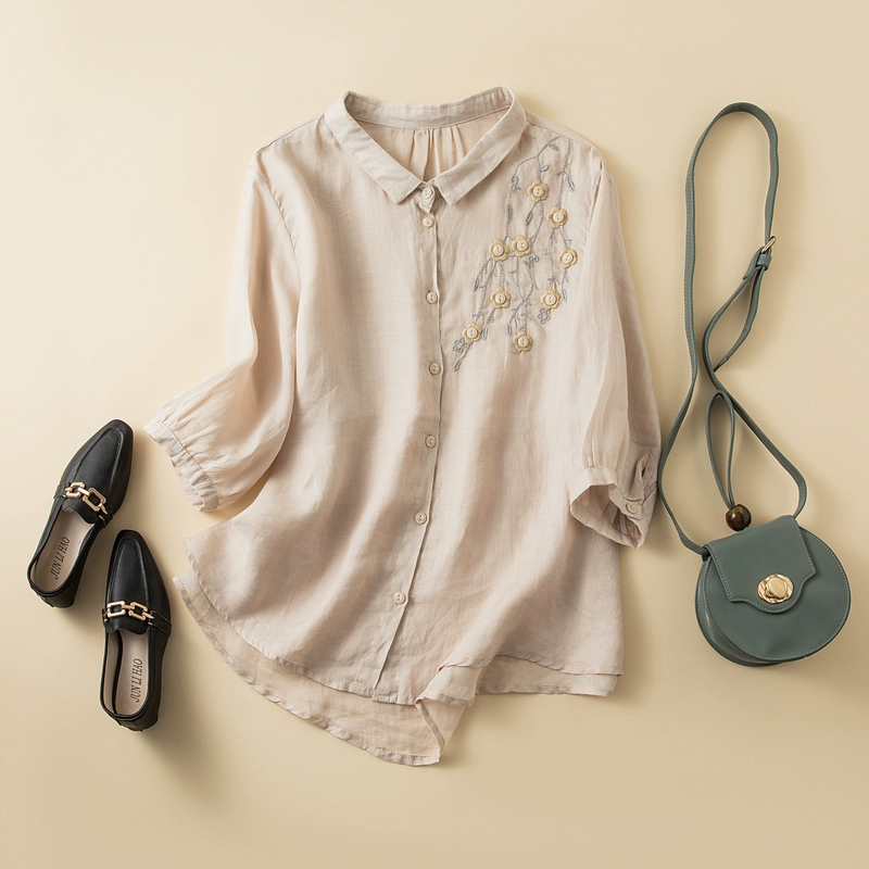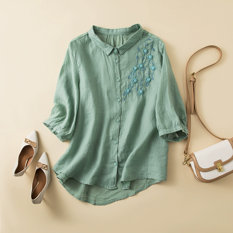 Lightweight retro loose buttoned mid-sleeve cotton and linen top
