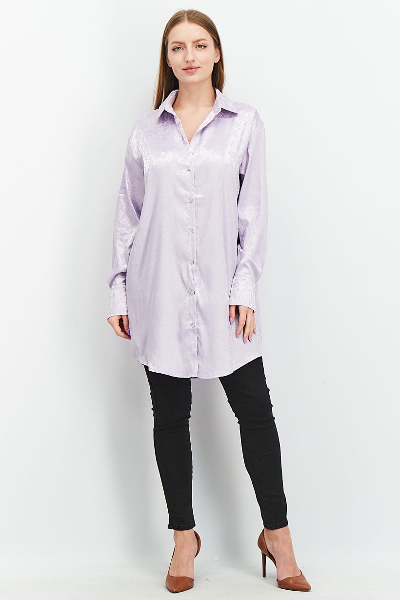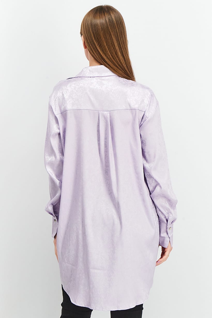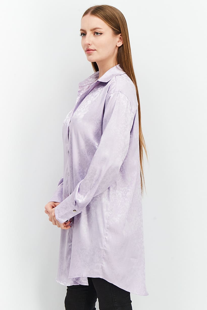 This blouse is designed for a regular fit and is machine washable for easy care. It features a notched collar and long sleeves with a button closure. The curved hem adds a stylish touch, while the floral pattern in a lovely lavender color family makes it perfect for casual occasions. Please note that the product color may vary slightly due to lighting or monitor settings. Made from 100% polyester fabric.