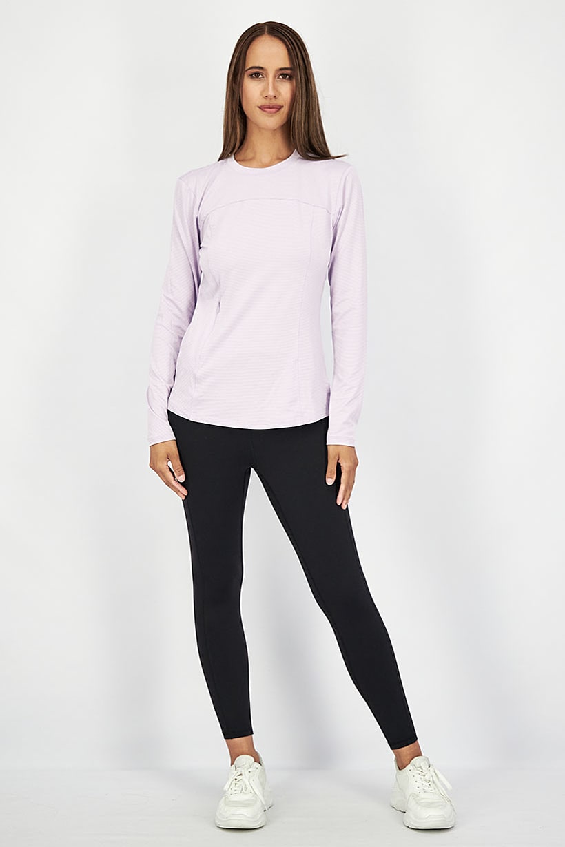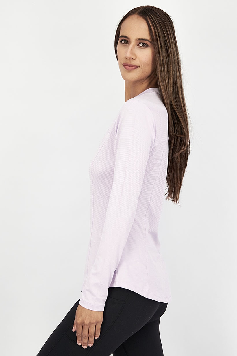 Care : Machine washable, Fit : Sportswear Fit, Ideal For : Women, Size shown : International, Sleeve Length : Long Sleeve, Thickness : Light, Type of Sport : Training, Types of Hem : Straight hem, Types of Neckline & Collar : Crew neckline, Types of Sleeve : Longsleeve, Disclaimer : Product color may slightly vary due to photographic lighting sources or your monitor settings., Fabrics : 91% Polyester, 9% Spandex, Pattern & Print : Textured pattern, Sportswear Type : Tops, Types of Closures : Pullover, Color Family : Lavender,