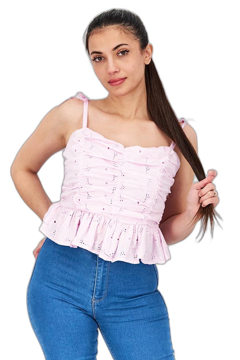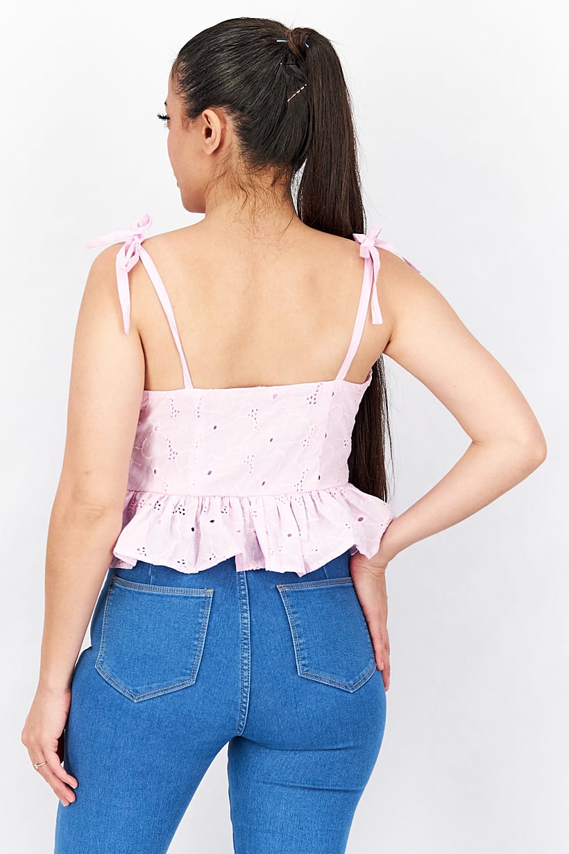 This product is made of 100% cotton and is machine washable. It has a regular fit and is available in international sizes. The top style is cropped with a straight hem and a sweetheart neckline with a sleeveless design. It features a textured pattern and a tie closure. Please note that the product color may vary slightly due to photographic lighting sources or monitor settings. This top is perfect for casual occasions.