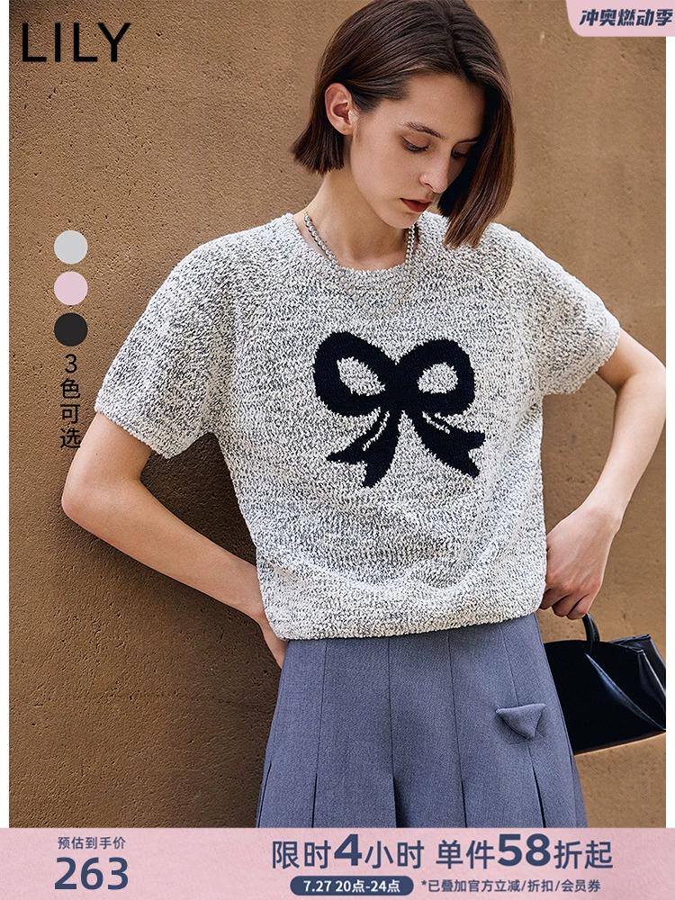 | nameOriginal | LILY2024 new autumn women's gray style versatile sweet bow round neck comfortable short-sleeved sweater top |