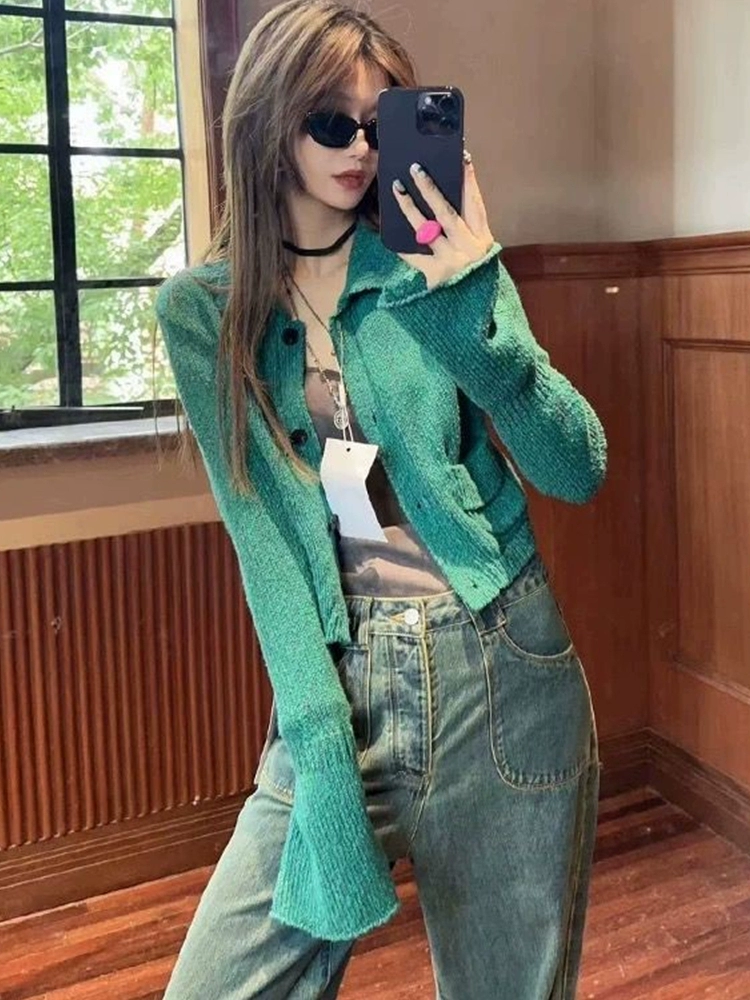 | nameOriginal | Lime green soft waxy lapel single-breasted cardigan sweater |