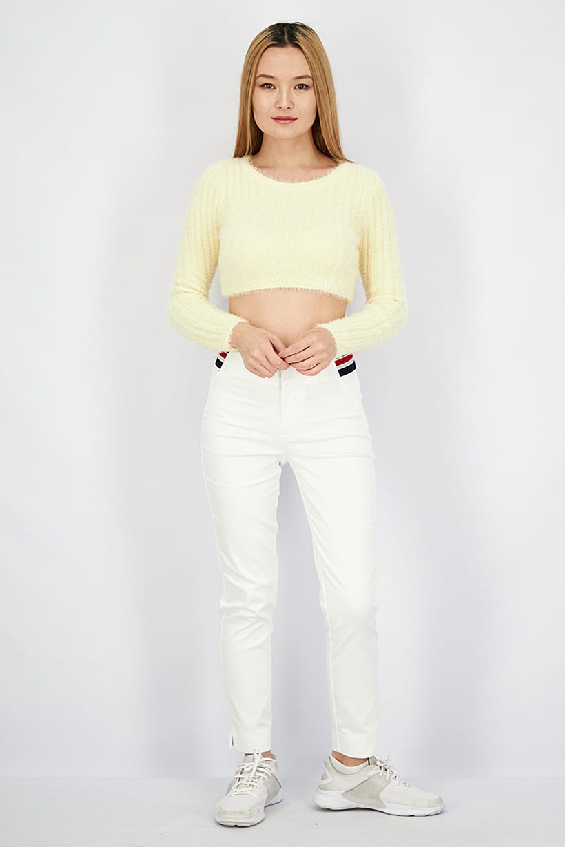 Lime Yellow Fluffy Rib Crop Sweater for Women with Crew Neck.