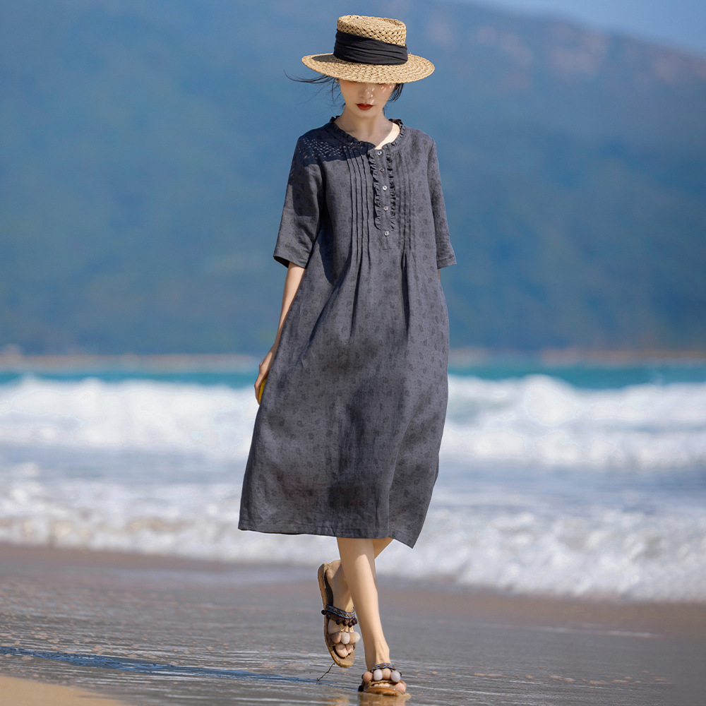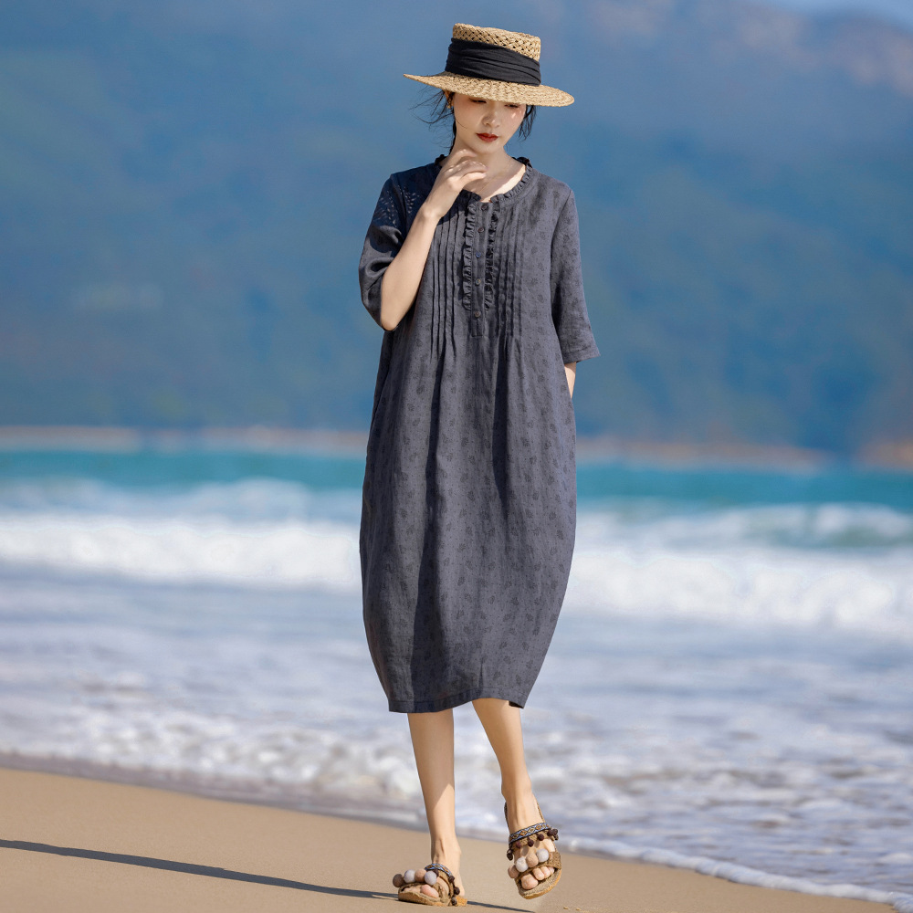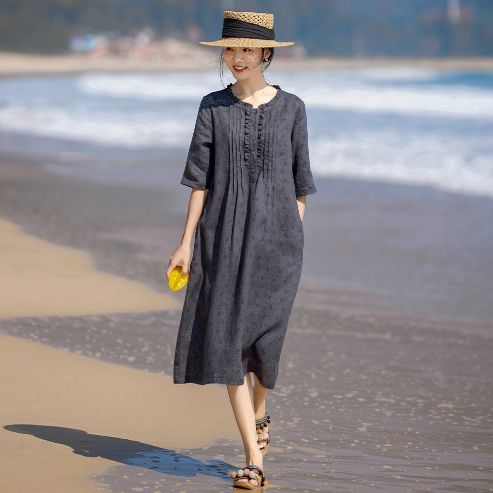 | nameOriginal | Linen floral dress vintage lace round neck organ pleated half sleeve printed A- line skirt 24 spring and summer original new |
