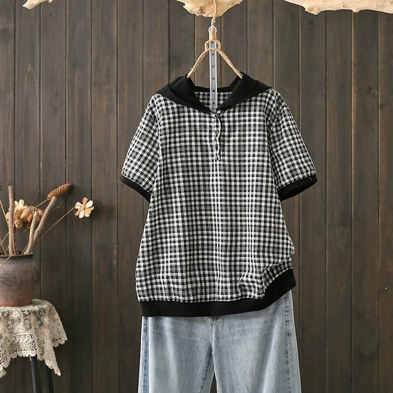| nameOriginal | Literary 200 pounds black and white casual retro plaid short sleeves |