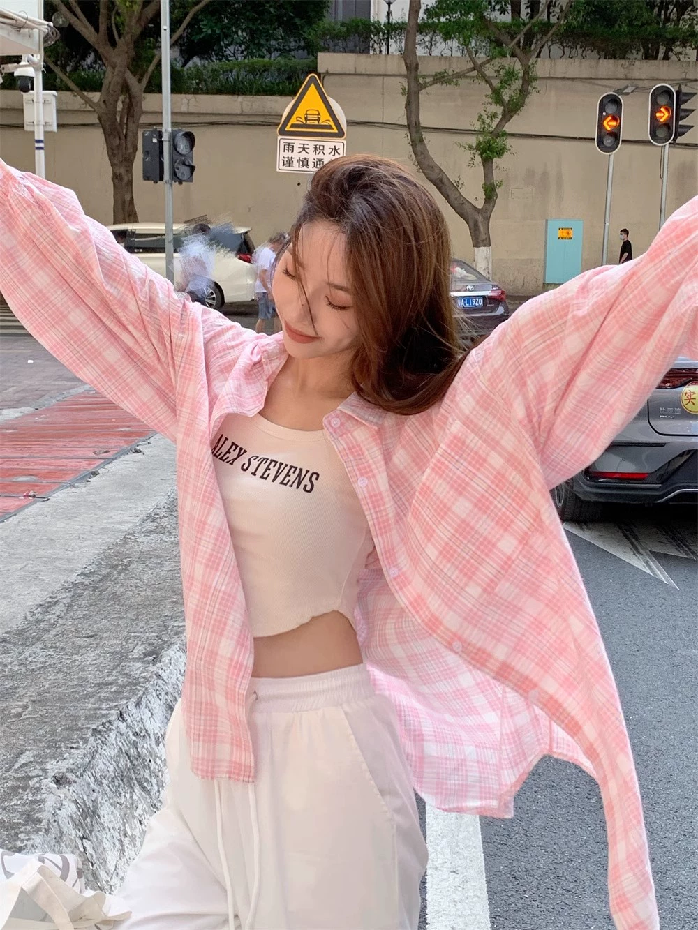 | nameOriginal | Literary plaid thin long-sleeved shirt for women spring 2024 new pink fresh sunscreen mid-length top |