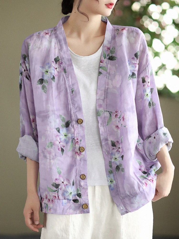 Literary printed linen cardigan sun protection clothing for women summer thin cotton and linen sun protection shirt with loose thin coat top