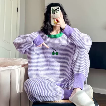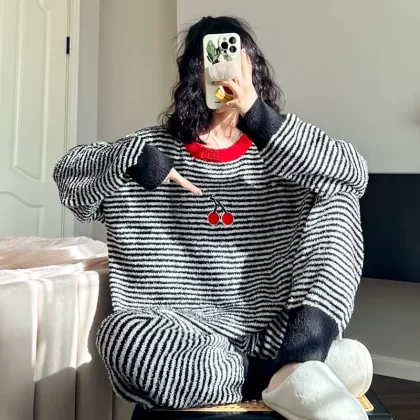 | nameOriginal | Little Cherry Contrast Color Collar Women's Soft Plush Pajamas |