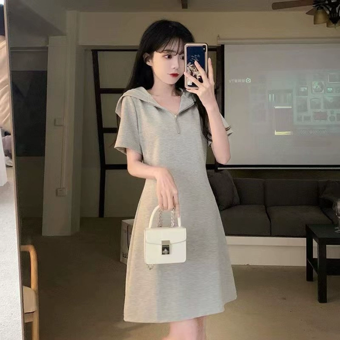 Little man hooded zipper short-sleeved sweatshirt dress summer new large size Korean version versatile fashion slim short dress