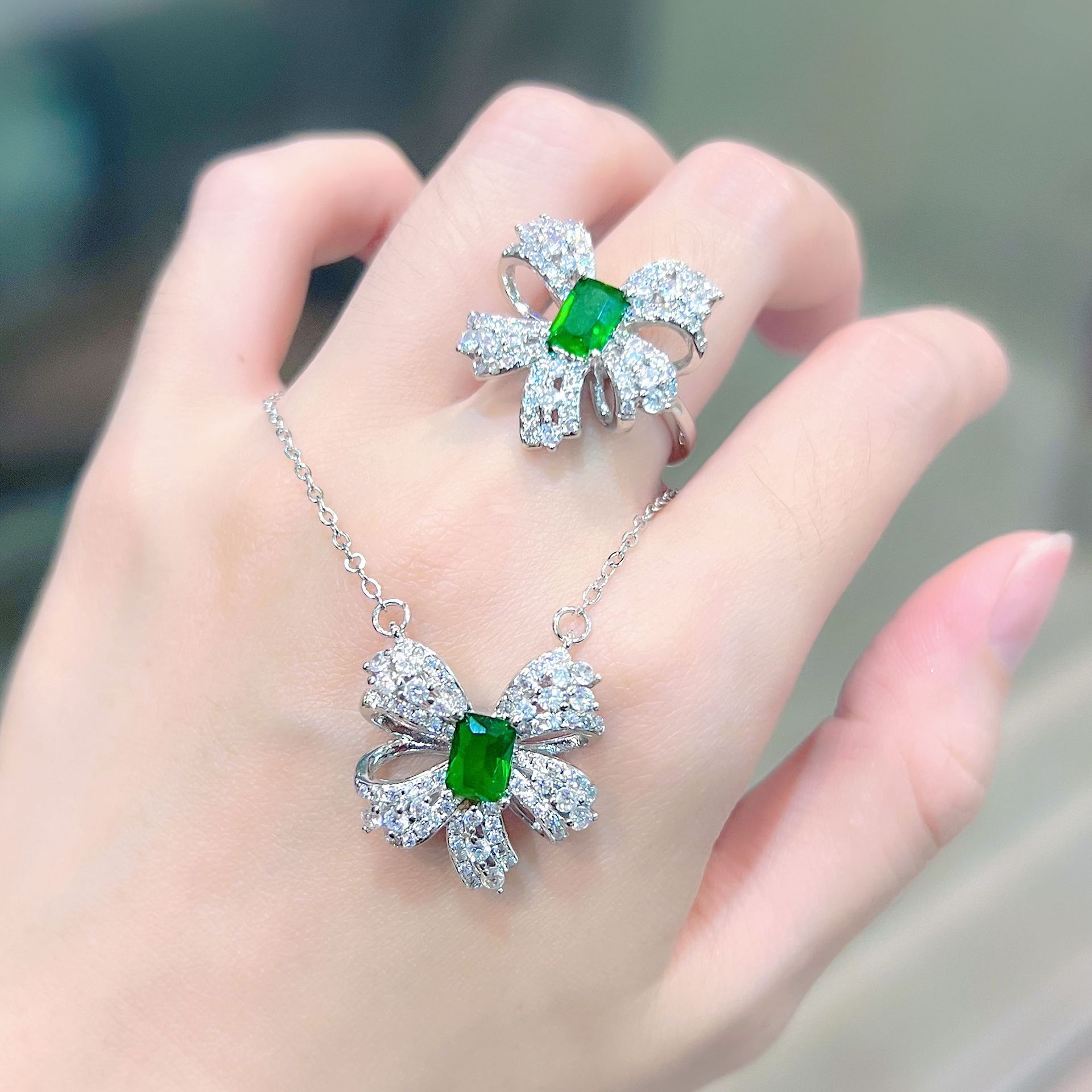 | nameOriginal | Live Hot Selling Butterfly Set Little Red Book Recommended Emerald Butterfly Earrings Pendant Necklace Ring |