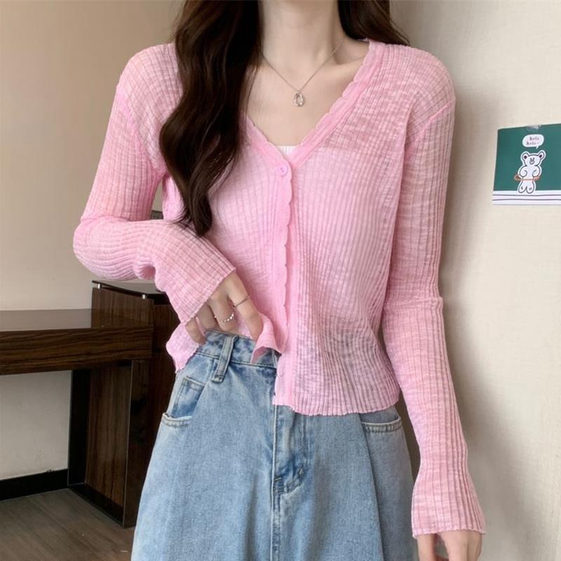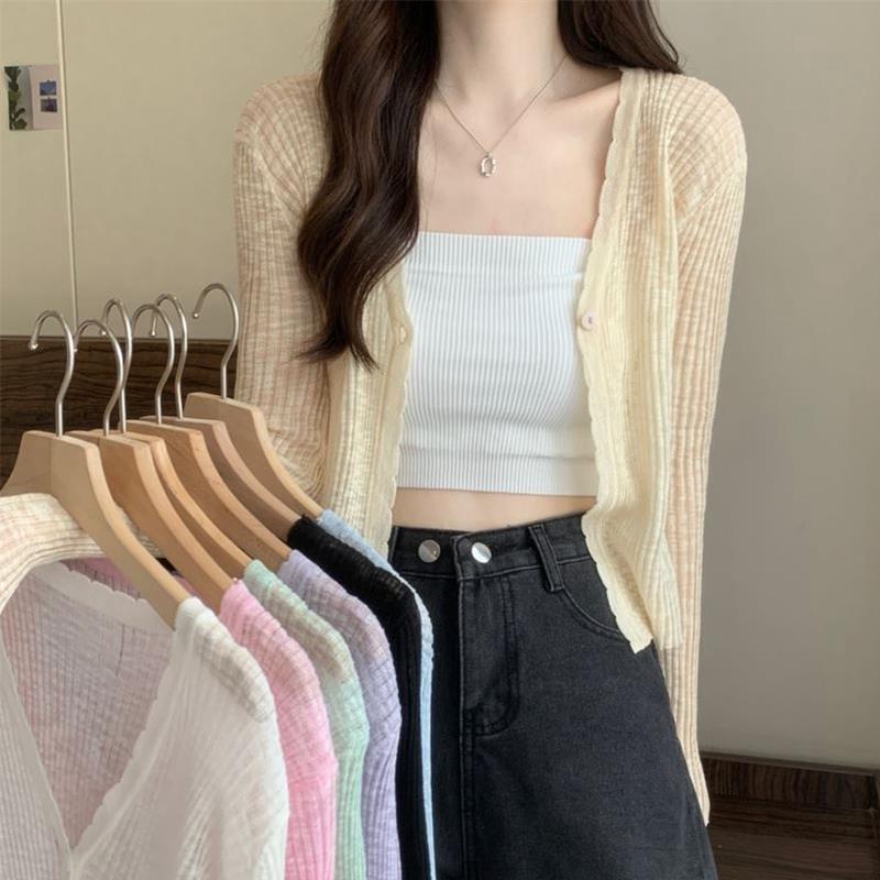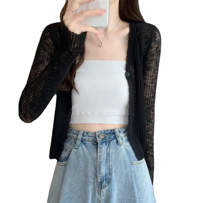 Lixu Ice Silk Thin Micro-penetration Knitted Cardigan Jacket Women’s Summer Long-sleeved Air-conditioning Shirt Sunscreen Shawl Top Short