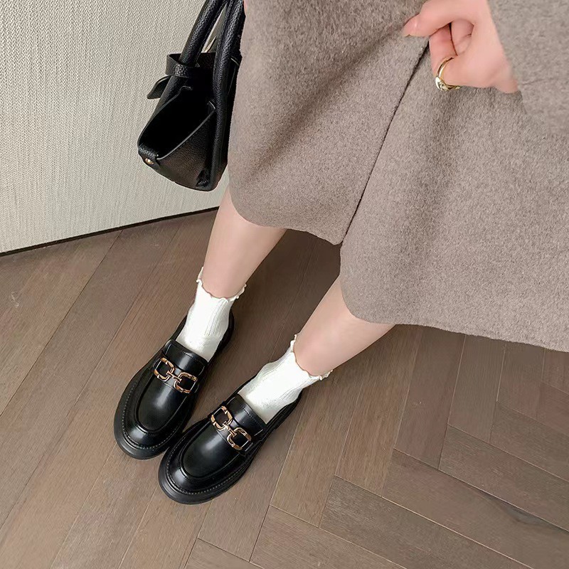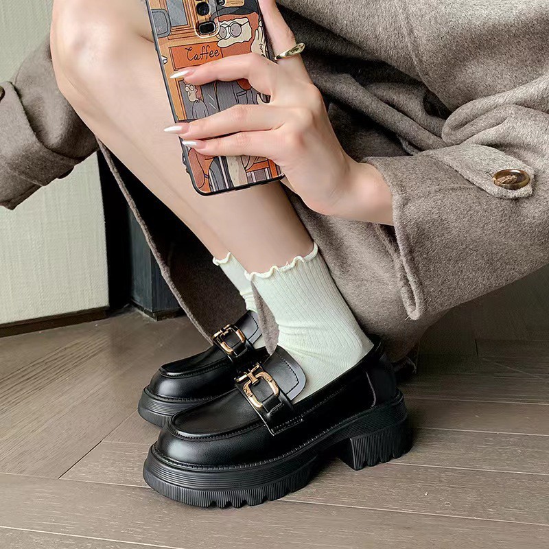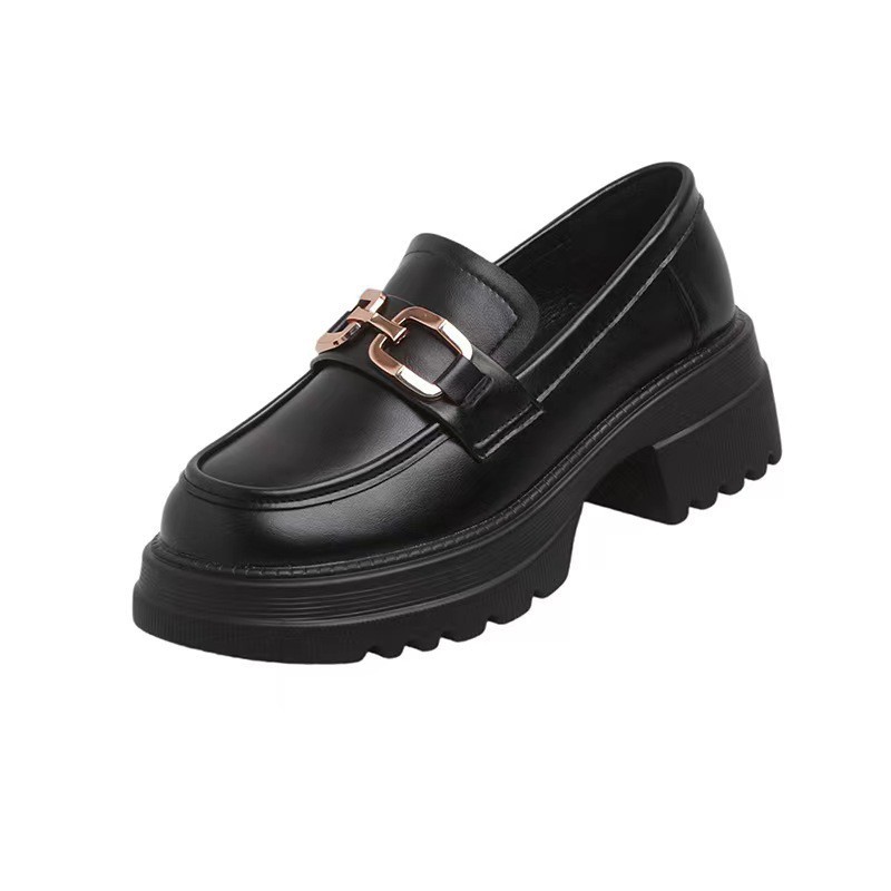 Loafers Women's Shoes Spring and Autumn Four Seasons British Style Single-layer Shoes Metal Buckle JK Non-slip Lightweight Thick-soled Height-increasing Small Leather Shoes
