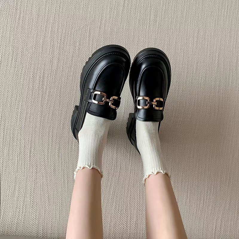 Loafers Women’s Shoes Spring and Autumn Four Seasons British Style Single-layer Shoes Metal Buckle JK Non-slip Lightweight Thick-soled Height-increasing Small Leather Shoes