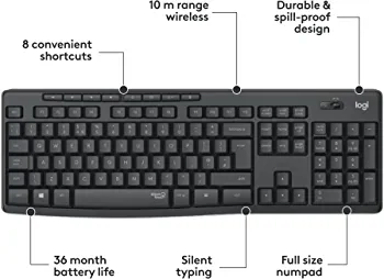 This product boasts innovative SilentTouch technology that allows for the same typing and clicking experience with significantly less noise. The keyboard is full-sized and includes eight convenient shortcuts and a numpad for efficient data entry and navigation. The mouse is both comfortable and compact, with a contoured shape and smooth, precise clicking and pointing on most surfaces. The wireless connection is lag-free and plug-and-play, connecting in just three seconds with a tiny USB receiver. The MK295 Silent is compatible with Windows or Chrome OS for easy setup. The spill-resistant design, durable keys, and sturdy tilt legs with adjustable height make this product built to last. Additionally, the battery life is impressive, with a 36-month keyboard and 18-month mouse battery life, plus on/off switches, allowing for months of use without the need to change batteries.