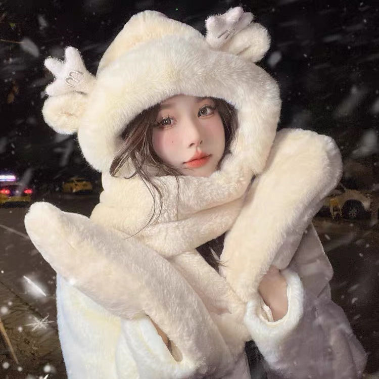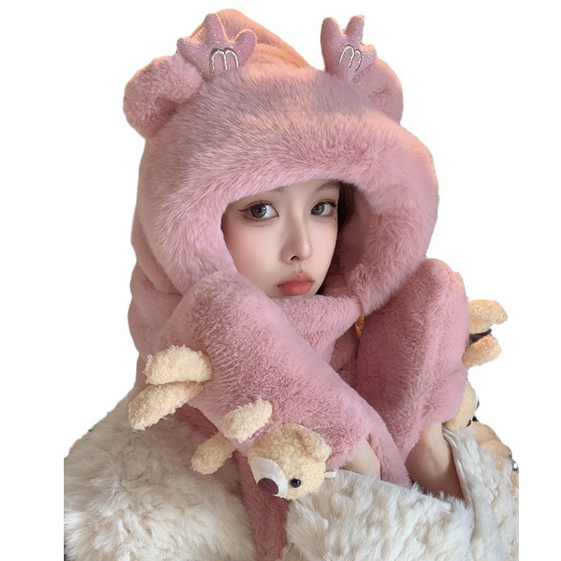 Long Bao hat autumn and winter women’s scarf gloves all-in-one hooded winter scarf cute warm plush winter three-piece set