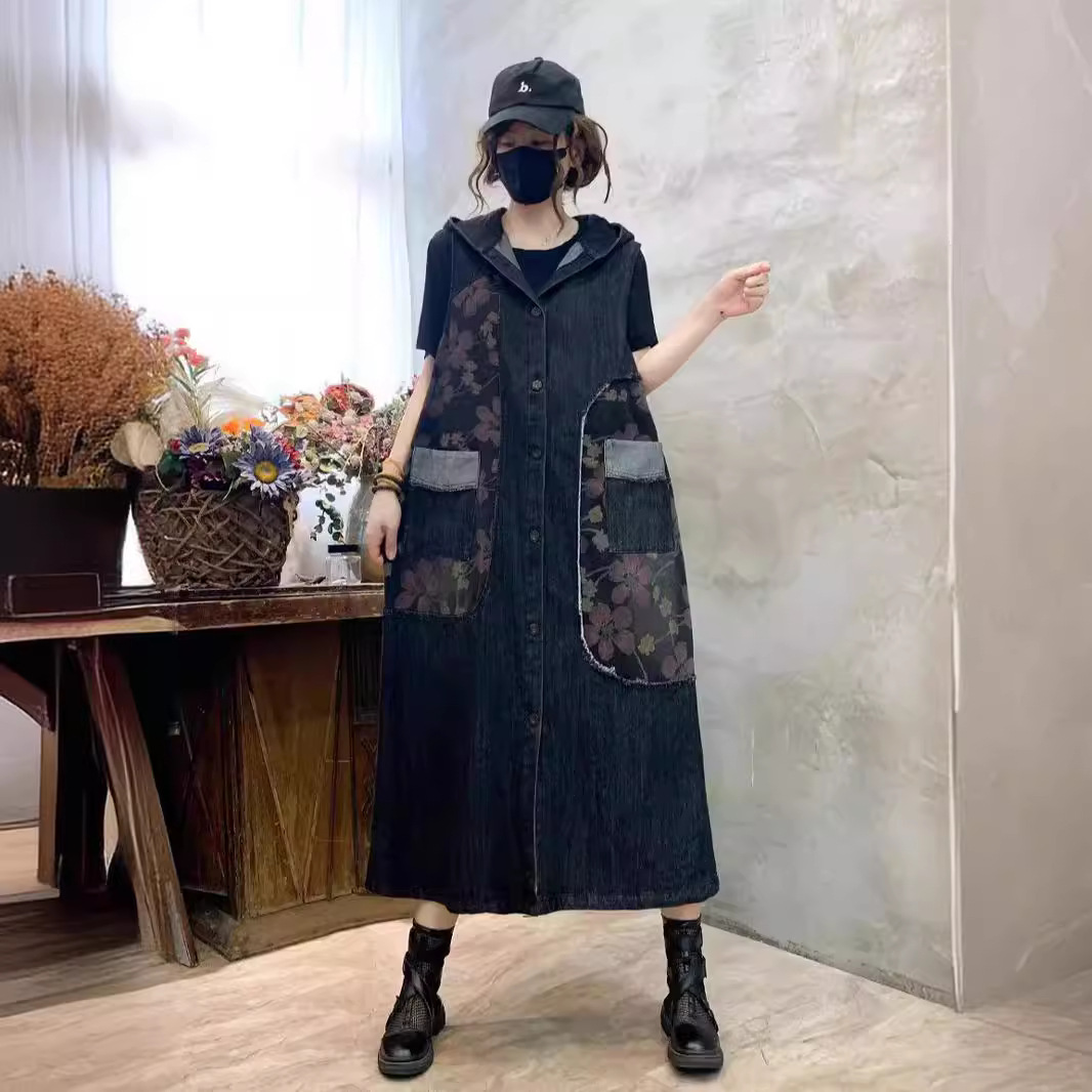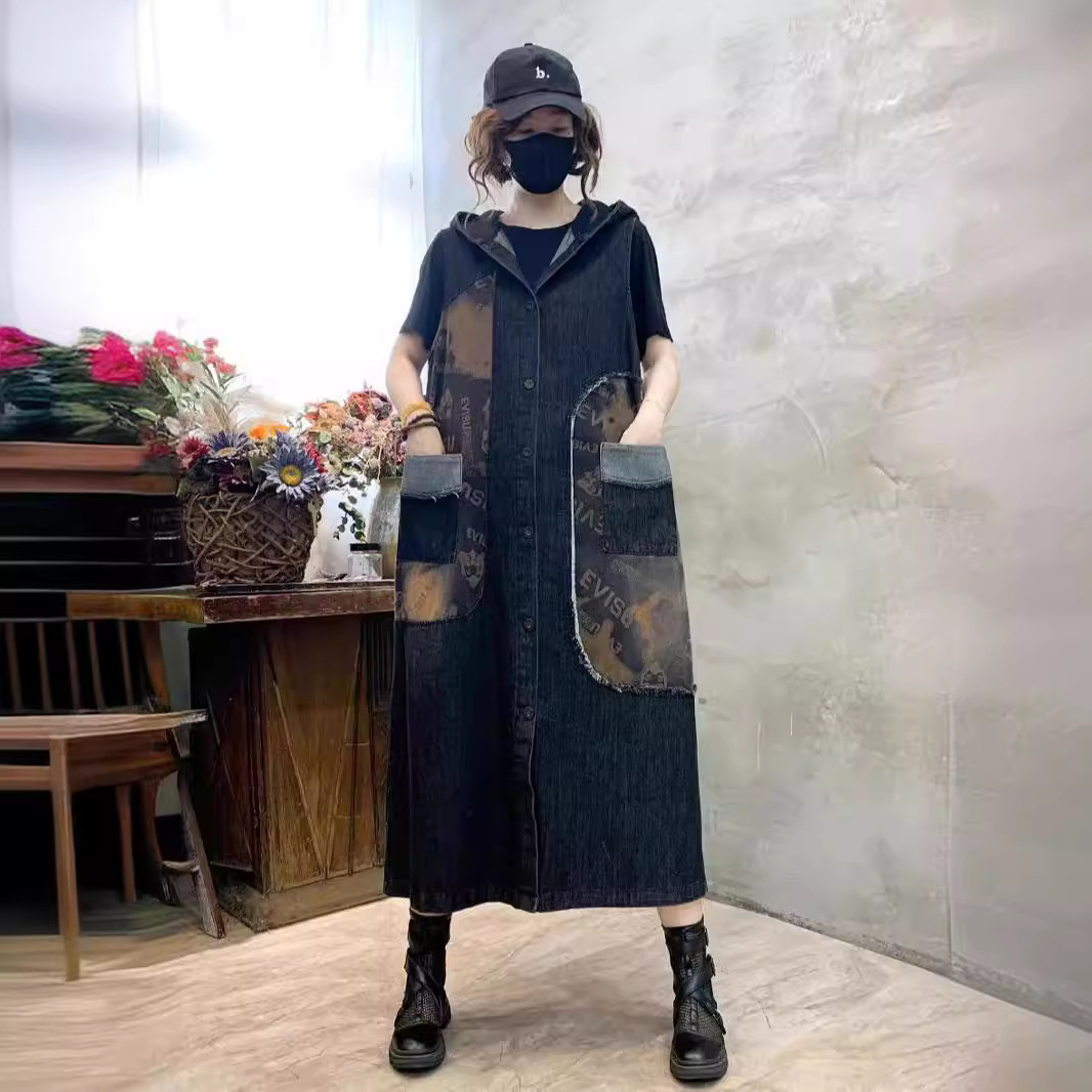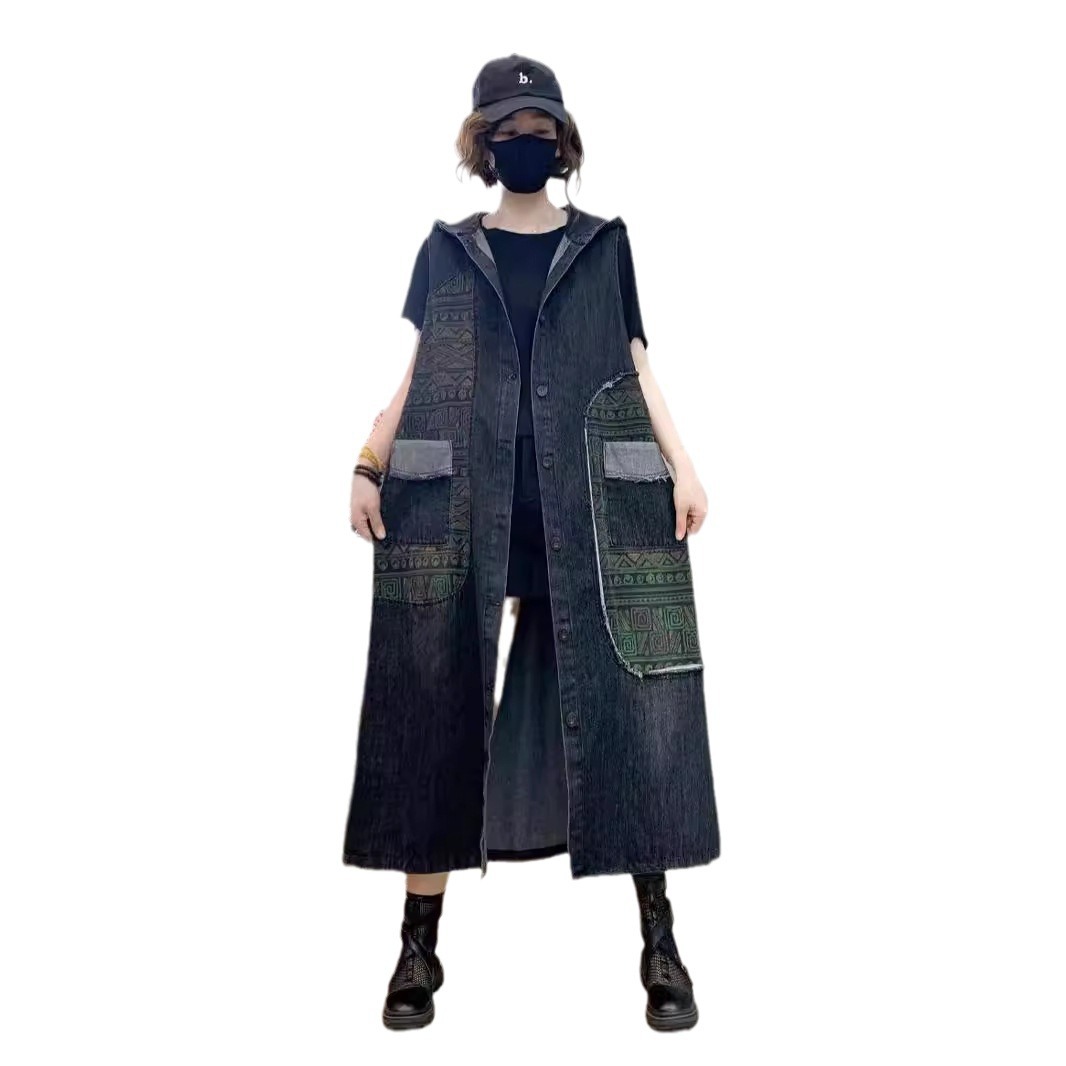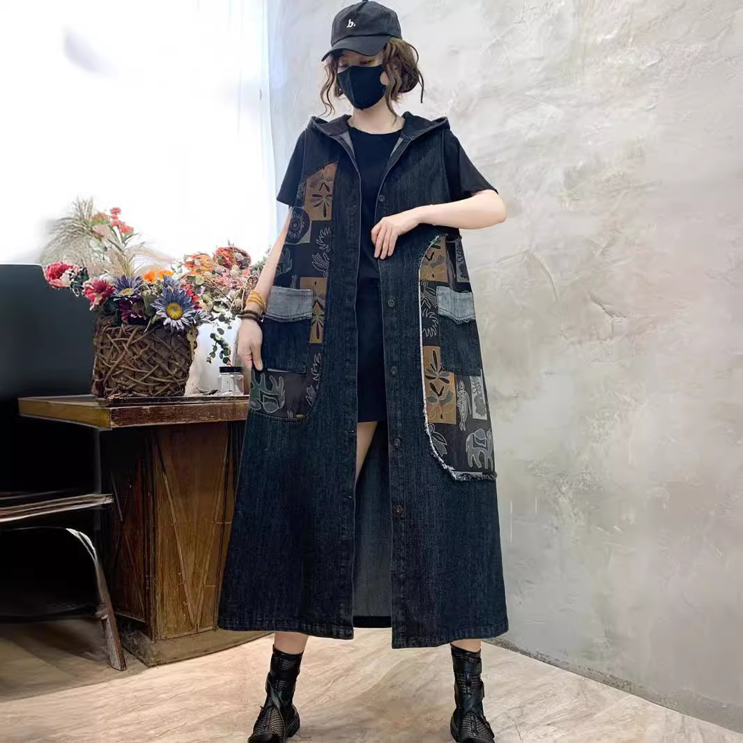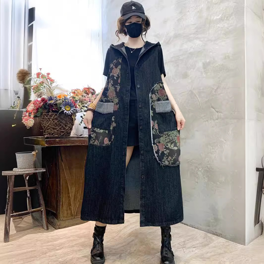 Long Denim Jacket Vest 2024 Autumn New Vintage Patchwork Loose Hooded Cardigan Outer Women