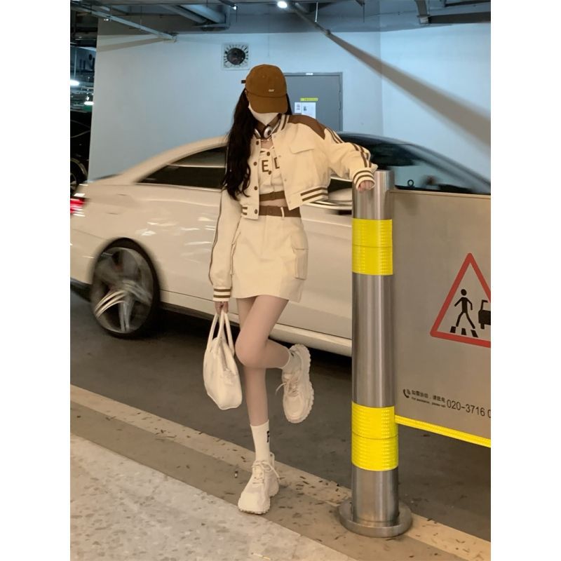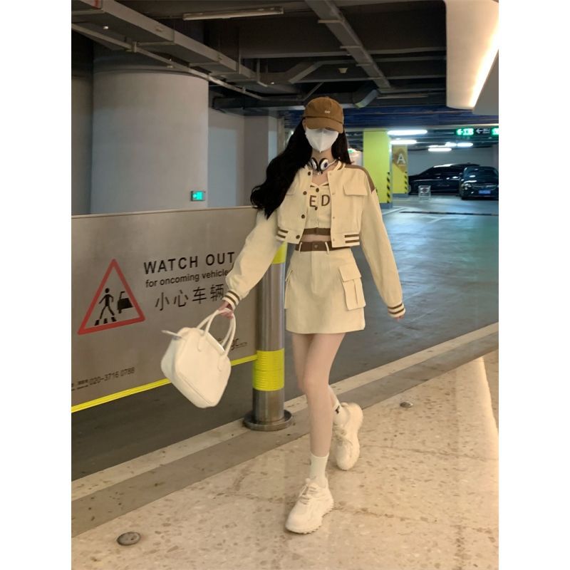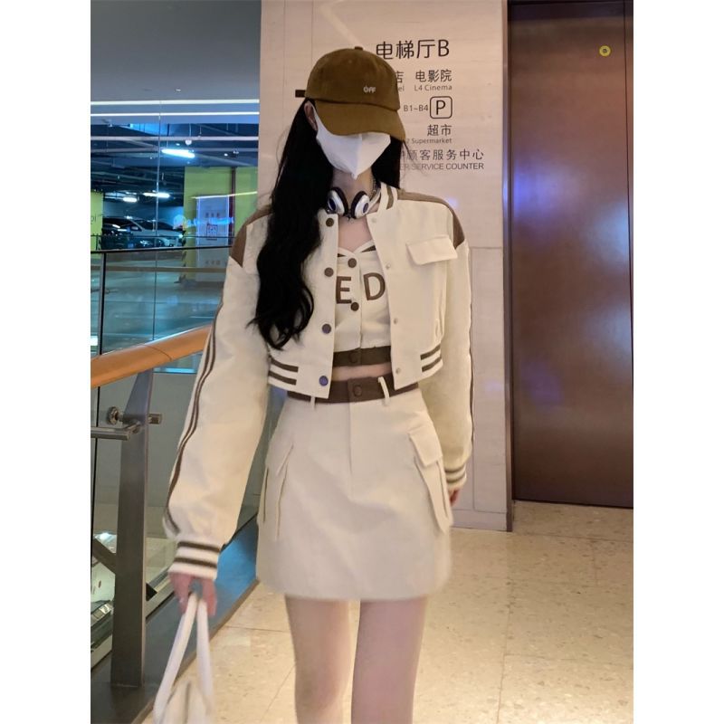 Long Sleeve Short Baseball Suit Coat Women's Camisole Autumn Fashion Elegant High Waist Half-length Short Skirt Three-piece Set