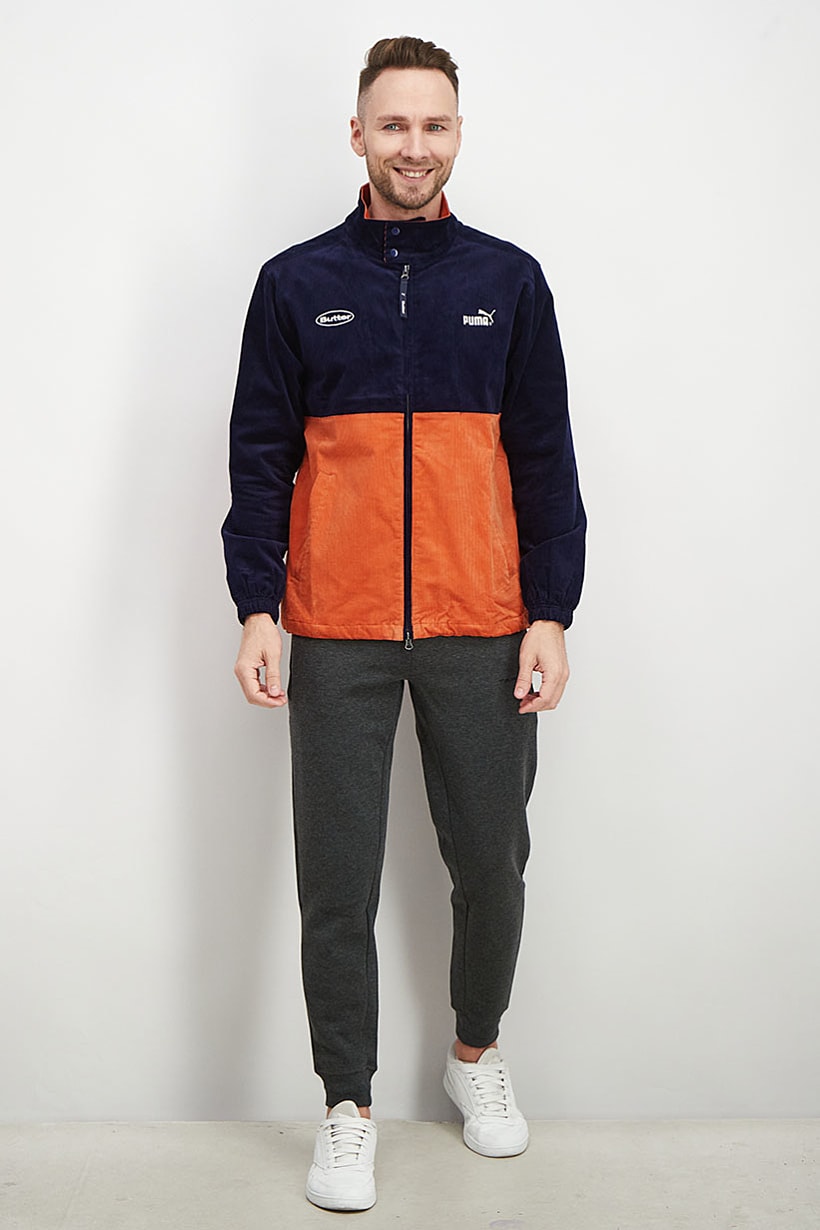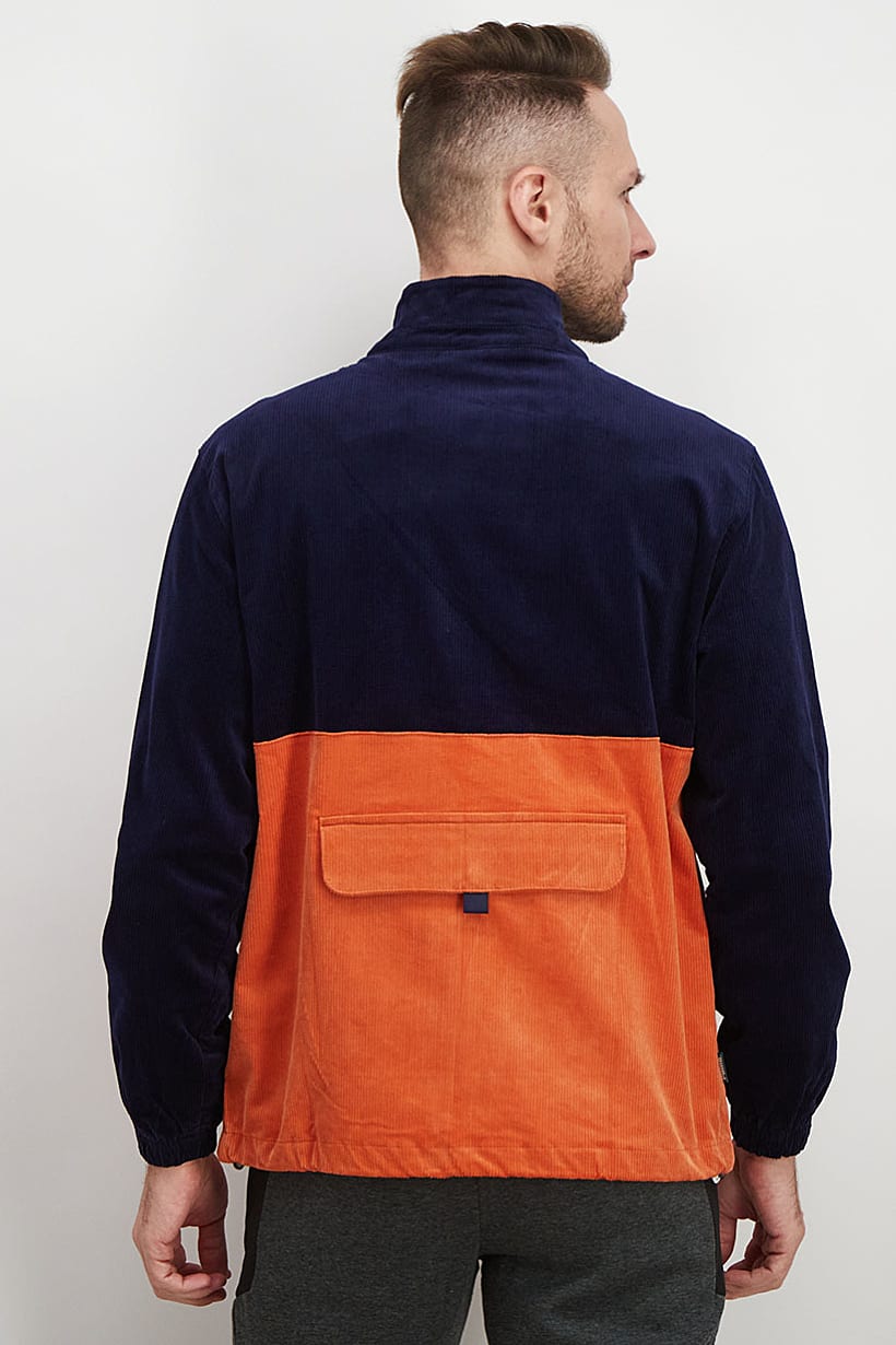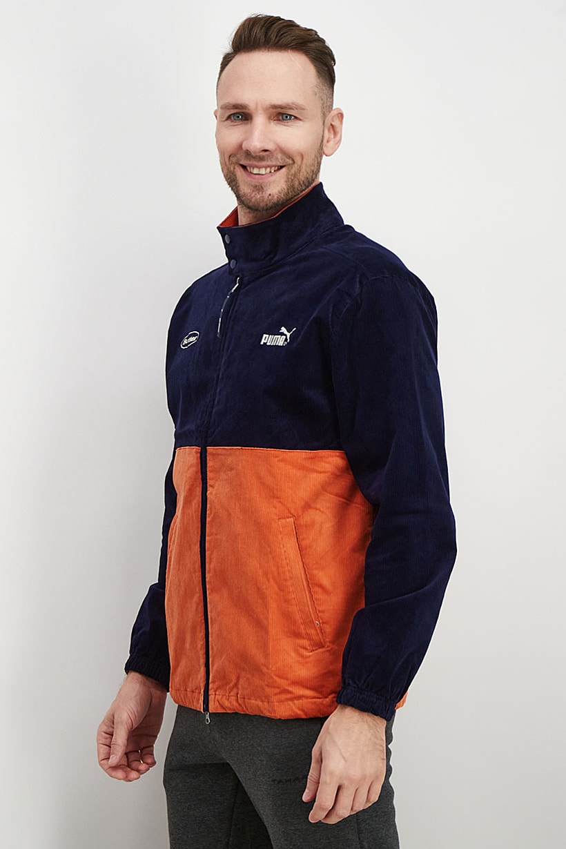 This sportswear jacket features a straight bottom hem and long sleeves, with a sportswear fit that is machine washable for easy care. It is made of a light, 97% cotton and 3% elastane fabric, with an embroidered logo pattern and print. The jacket has a zipper closure and is suitable for training in various sports. Please note that the product color may vary slightly due to photographic lighting or monitor settings. Available in navy blue and orange color family, and shown in US size.