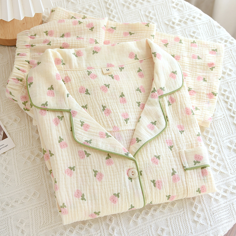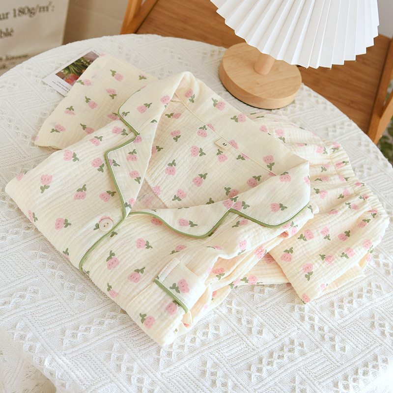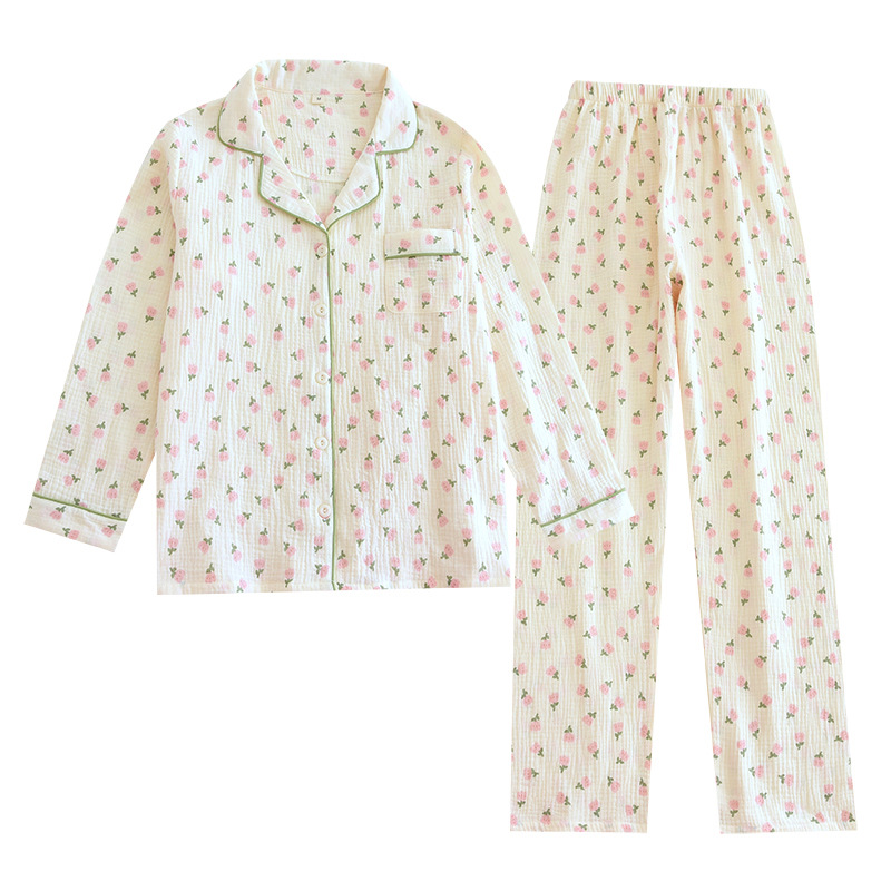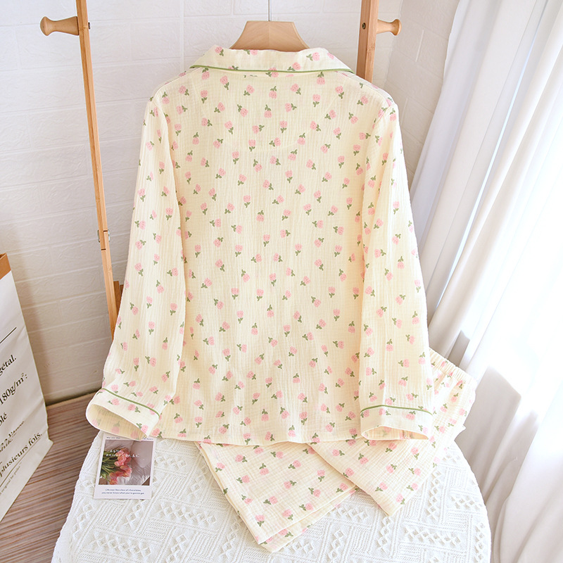 Long-sleeved pajamas women’s spring and autumn crepe home clothing floral lapel double gauze pajamas set wholesale generation