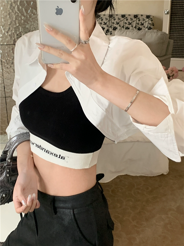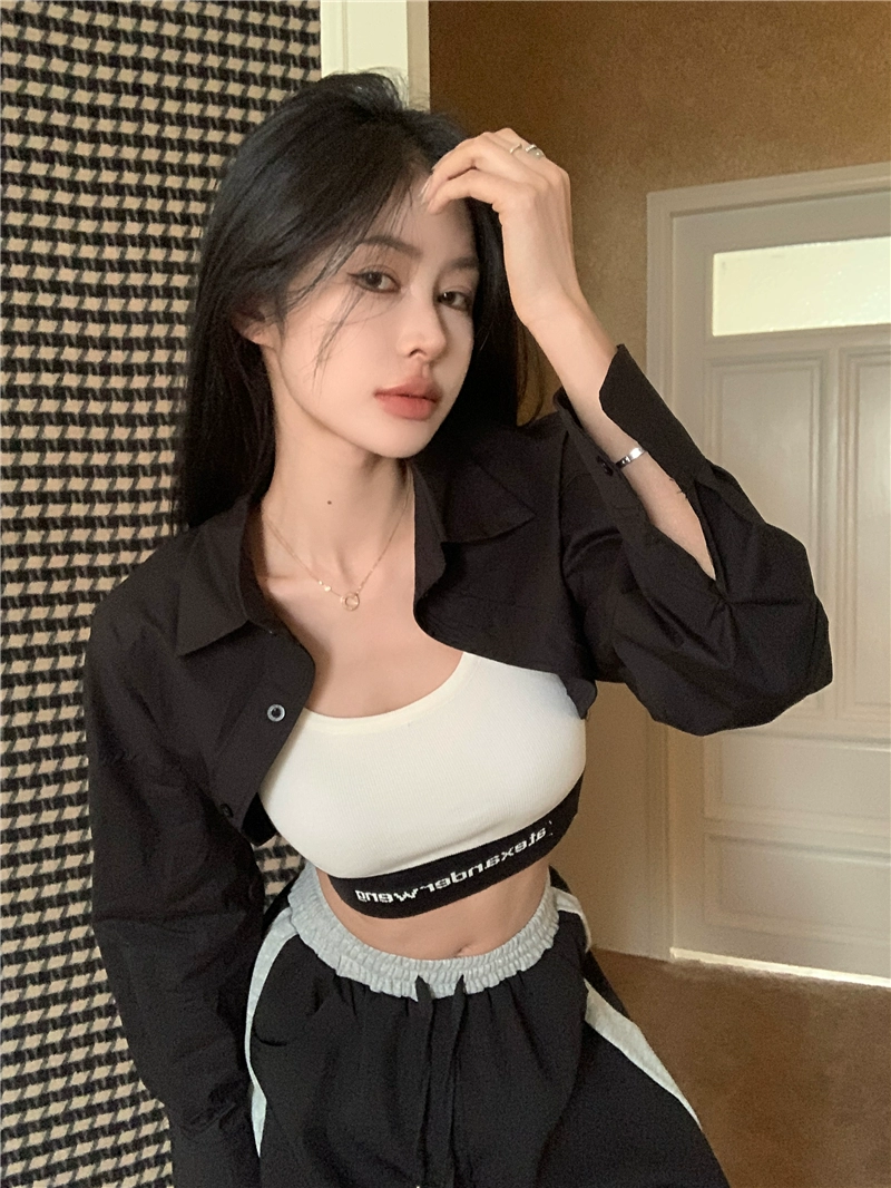 | nameOriginal | Long-sleeved shirt with exposed navel and contrasting color patchwork fashion suit |