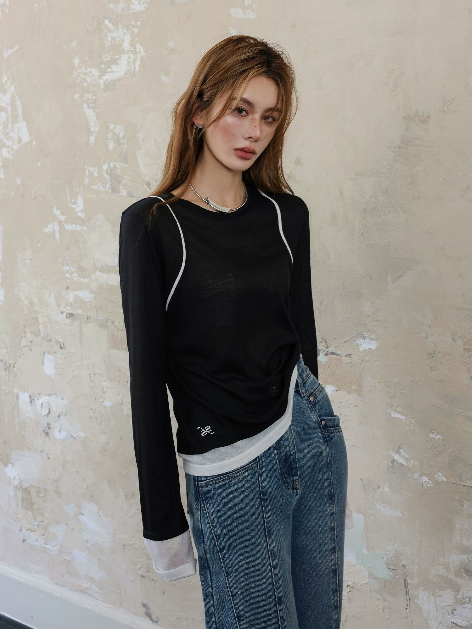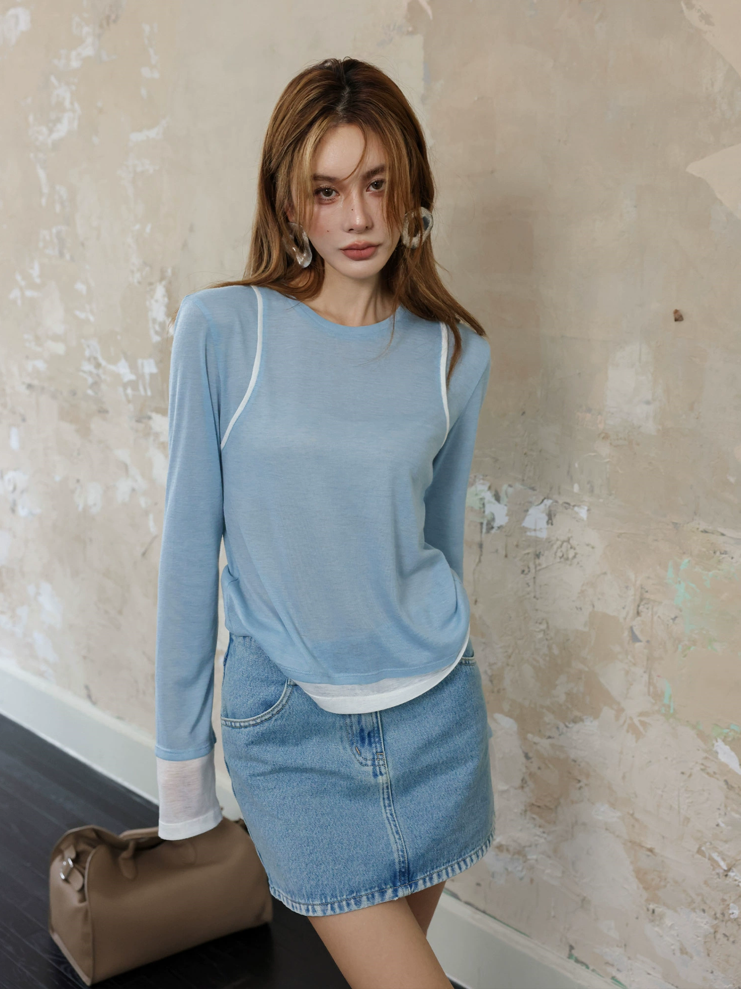 | nameOriginal | Long-sleeved spliced fake two-piece slightly see-through knitted T-shirt for women 2023 spring and autumn new style color-blocked layered sweater top |