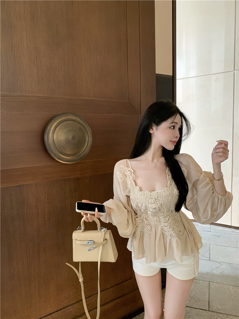 | nameOriginal | Long-sleeved square-neck lace-up sheer backless chiffon shirt |